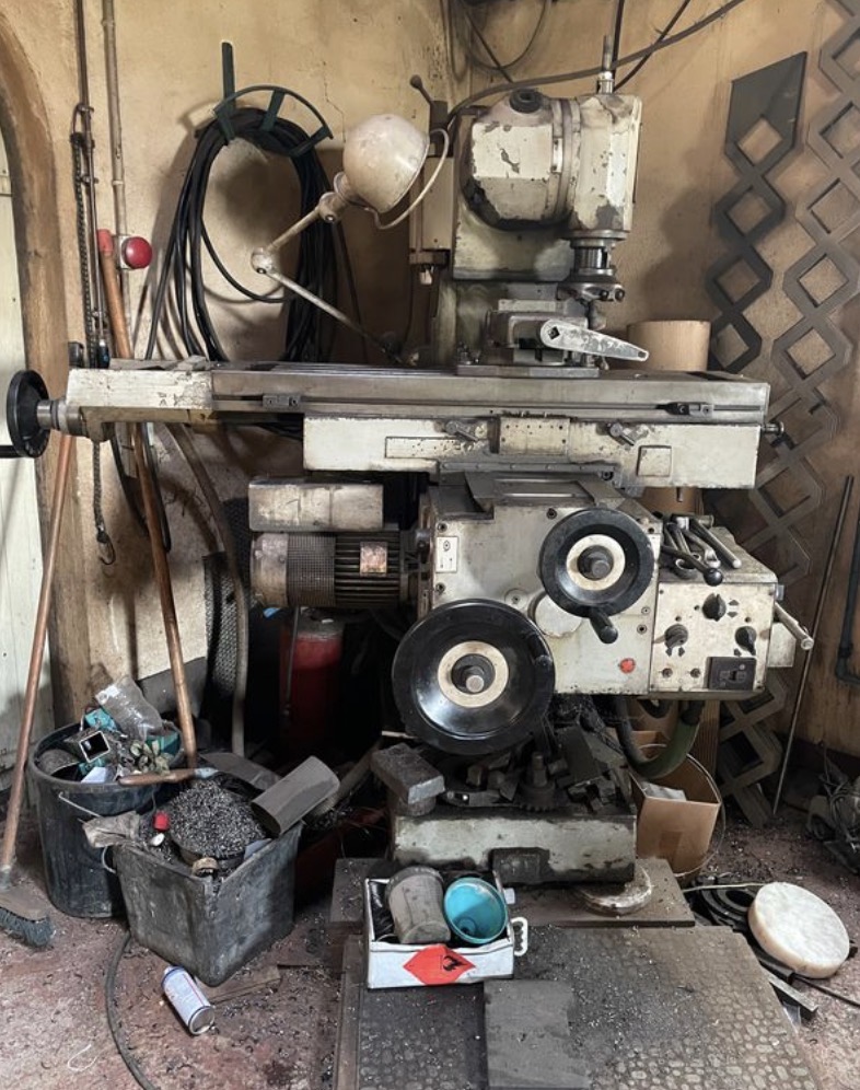 Twee Jieldé lampen die de freesbank verlichten en gespoten in dezelfde olijfgroene kleur als de machine.