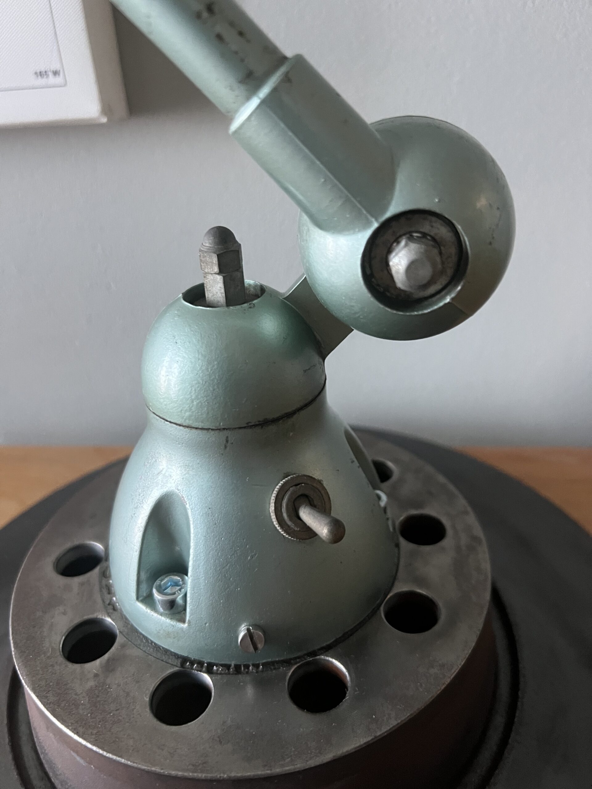 400 Jieldé lamp met twee armen in de originele Vespa groene kleur. Met een keramisch E27 fitting en een metalen druppelschakelaar. Geplaatst op een industriële remschijf als voet. Met een zwart etiket, de lamp is uit de periode 1980-1986. Mooi vintage exemplaar. (Met dank aan collega Menno den Hartog voor zijn opmerking over de datering van het zwarte etiket) € 295,00