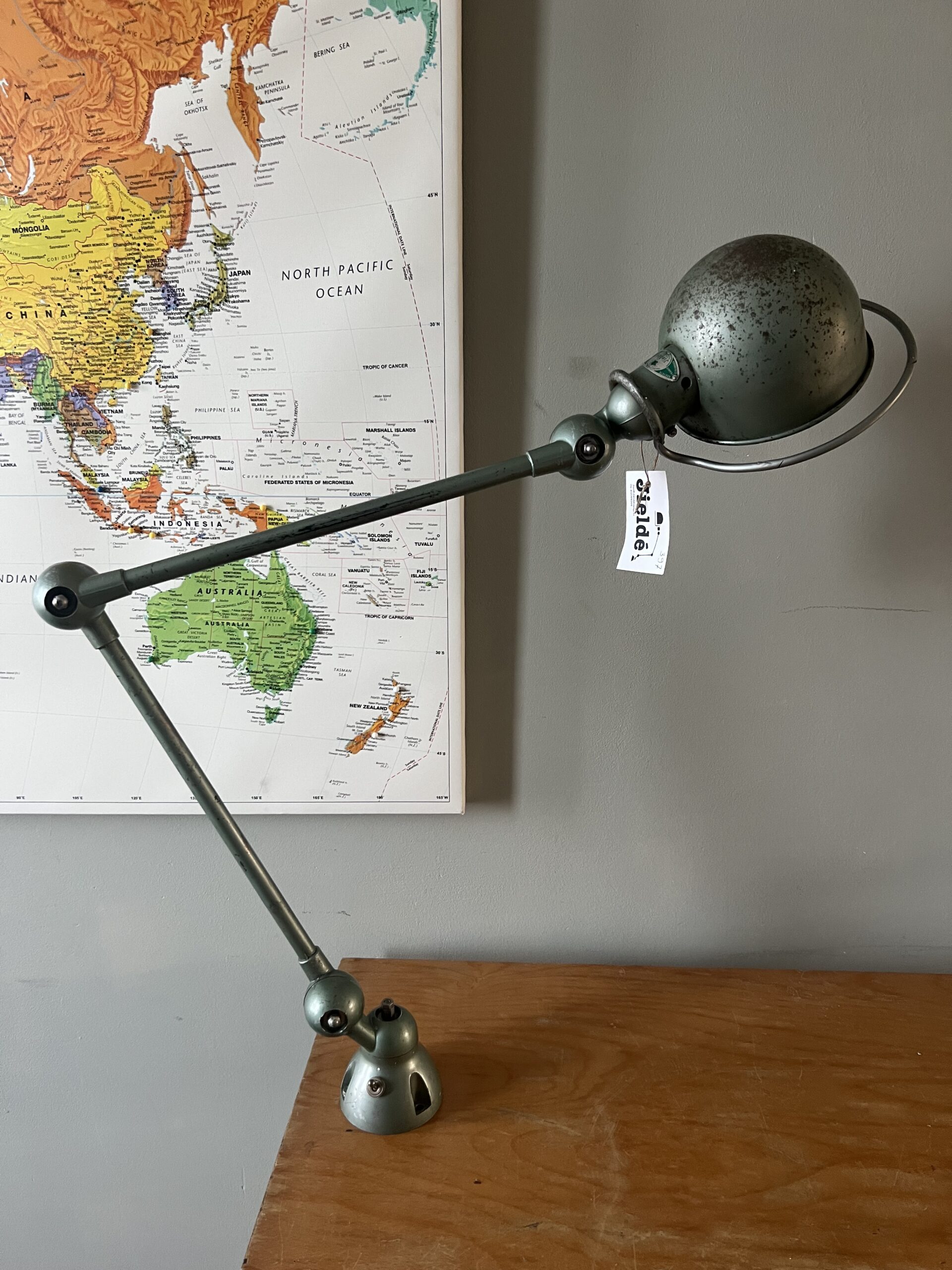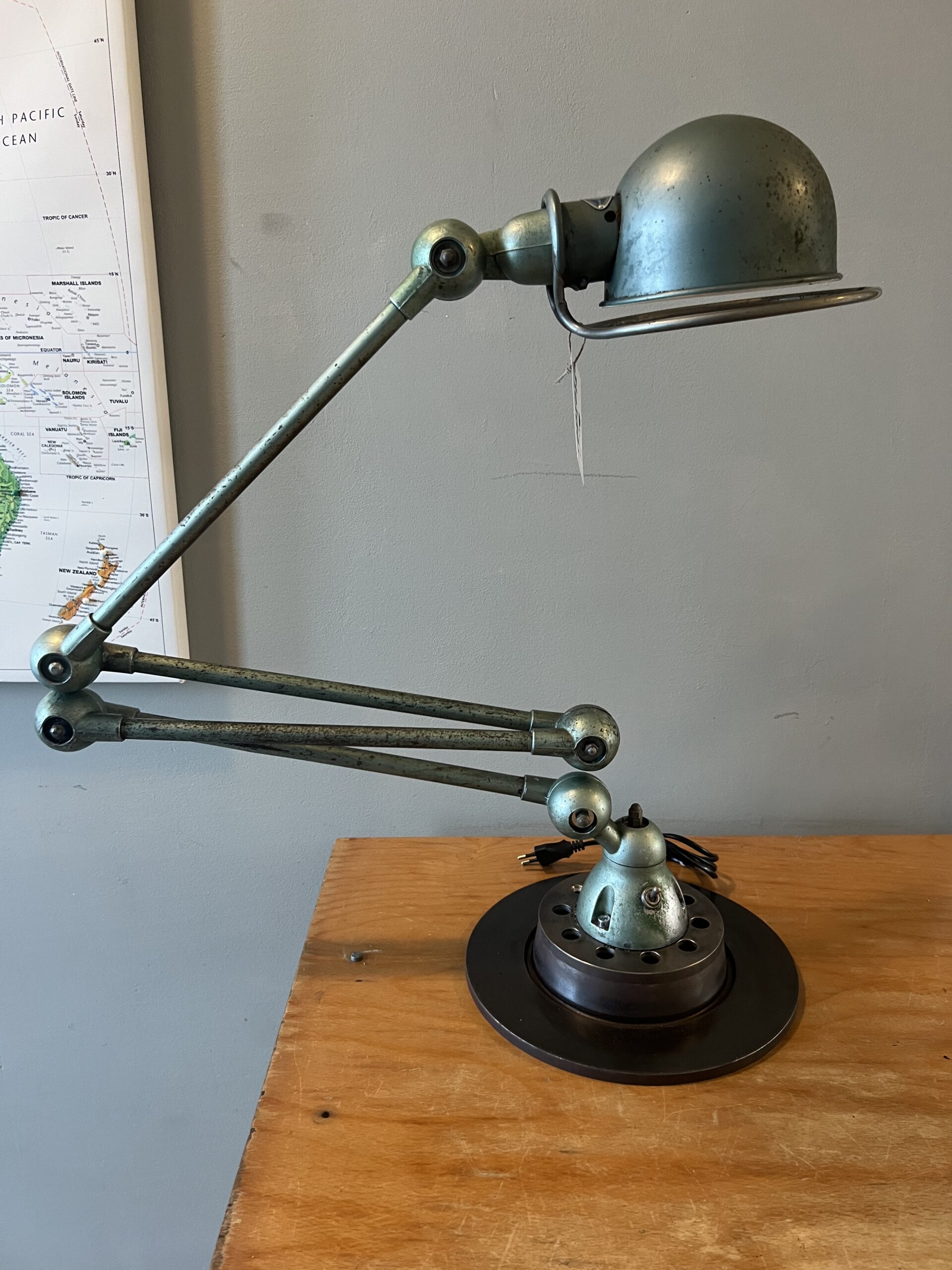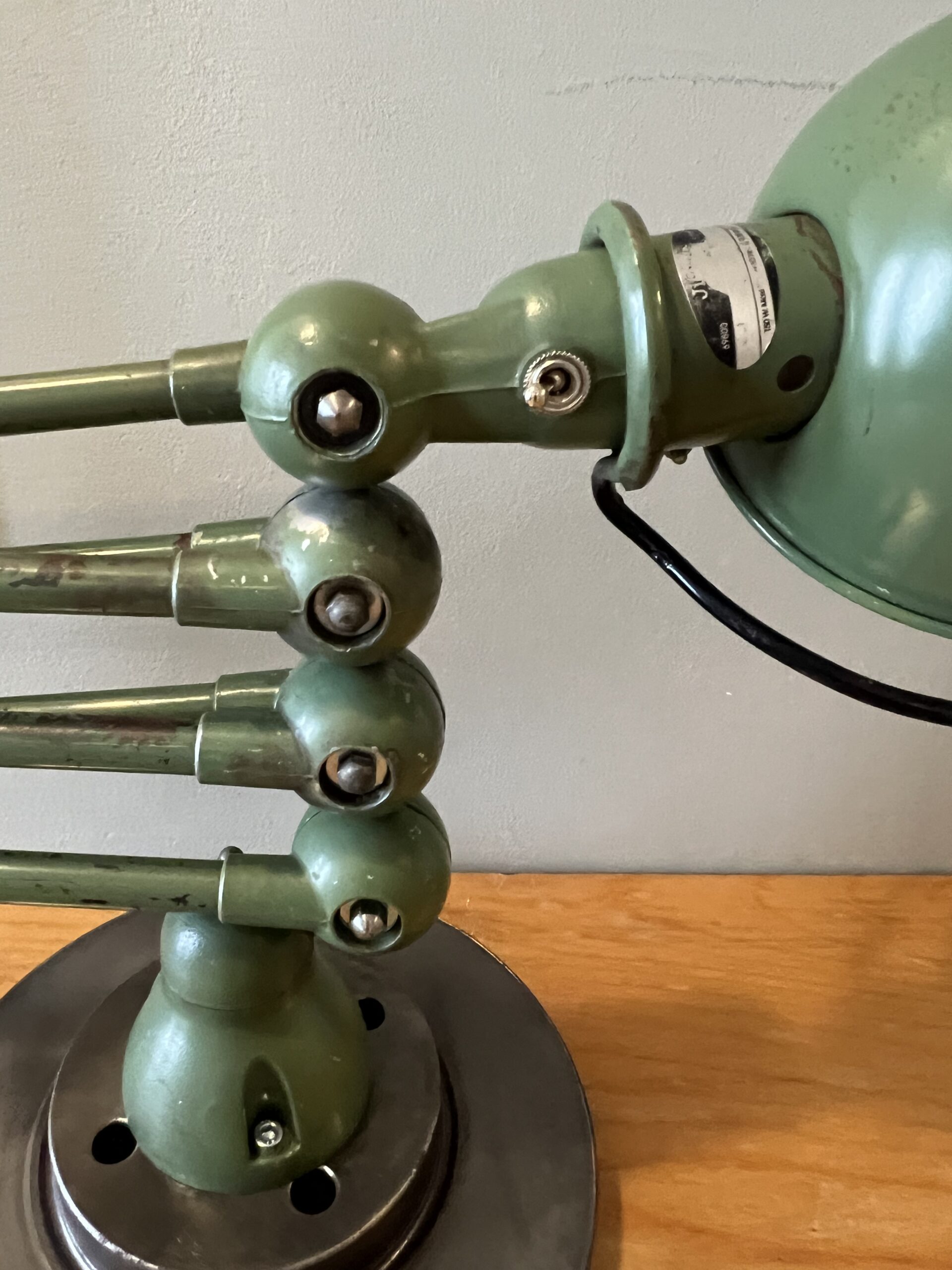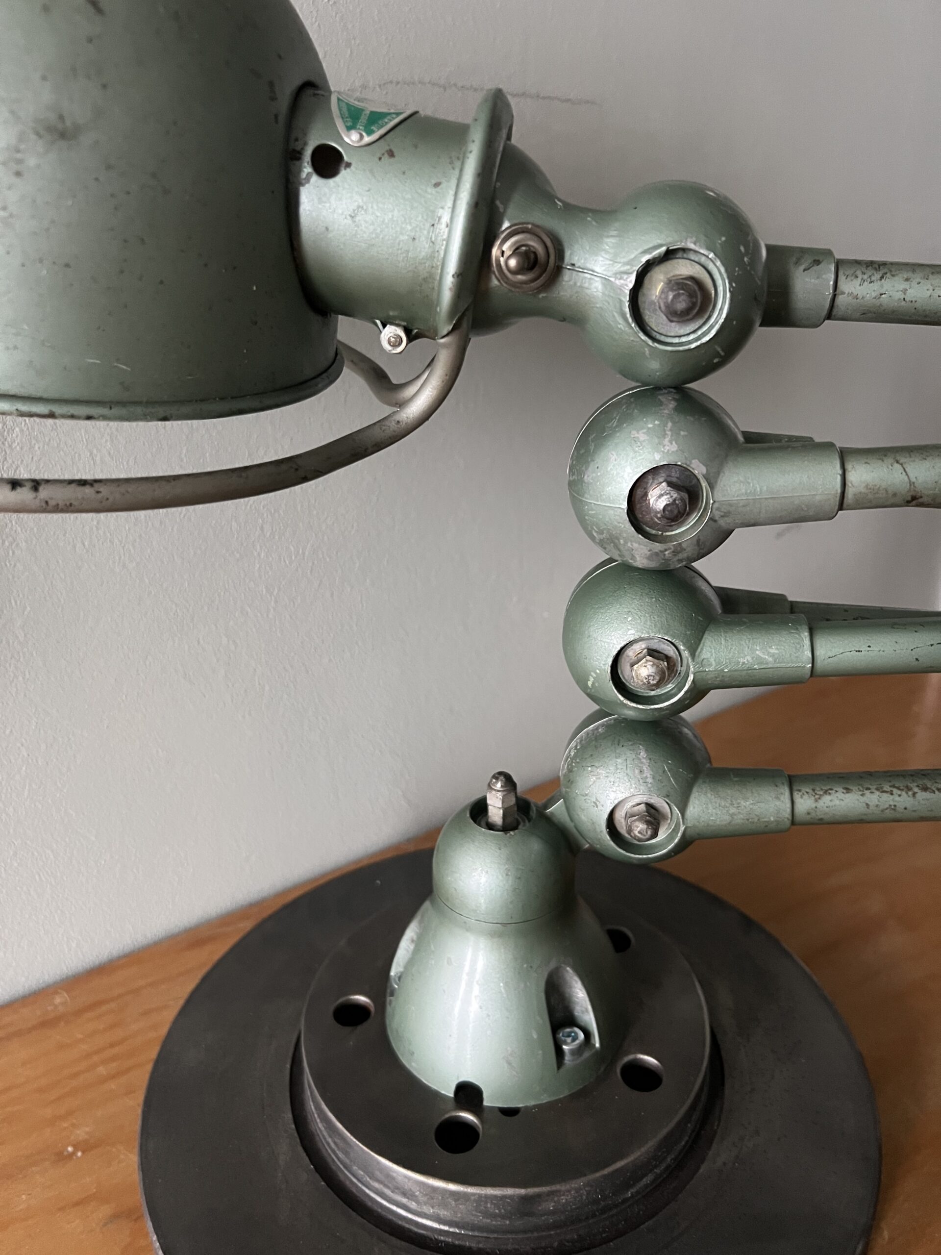 397 Jieldé bureau lamp, twee armen, in de originele Vespa groene kleur. Geheel in originele staat, mooie patina. Met een keramische E27 fitting, een metalen druppelschakelaar op de voet en een groen aluminium etiket, de lamp is dus uit de eerste periode 1950-1960. INCLUSIEF INDUSTRIËLE REMSCHIJF ALS VOET. VENDU