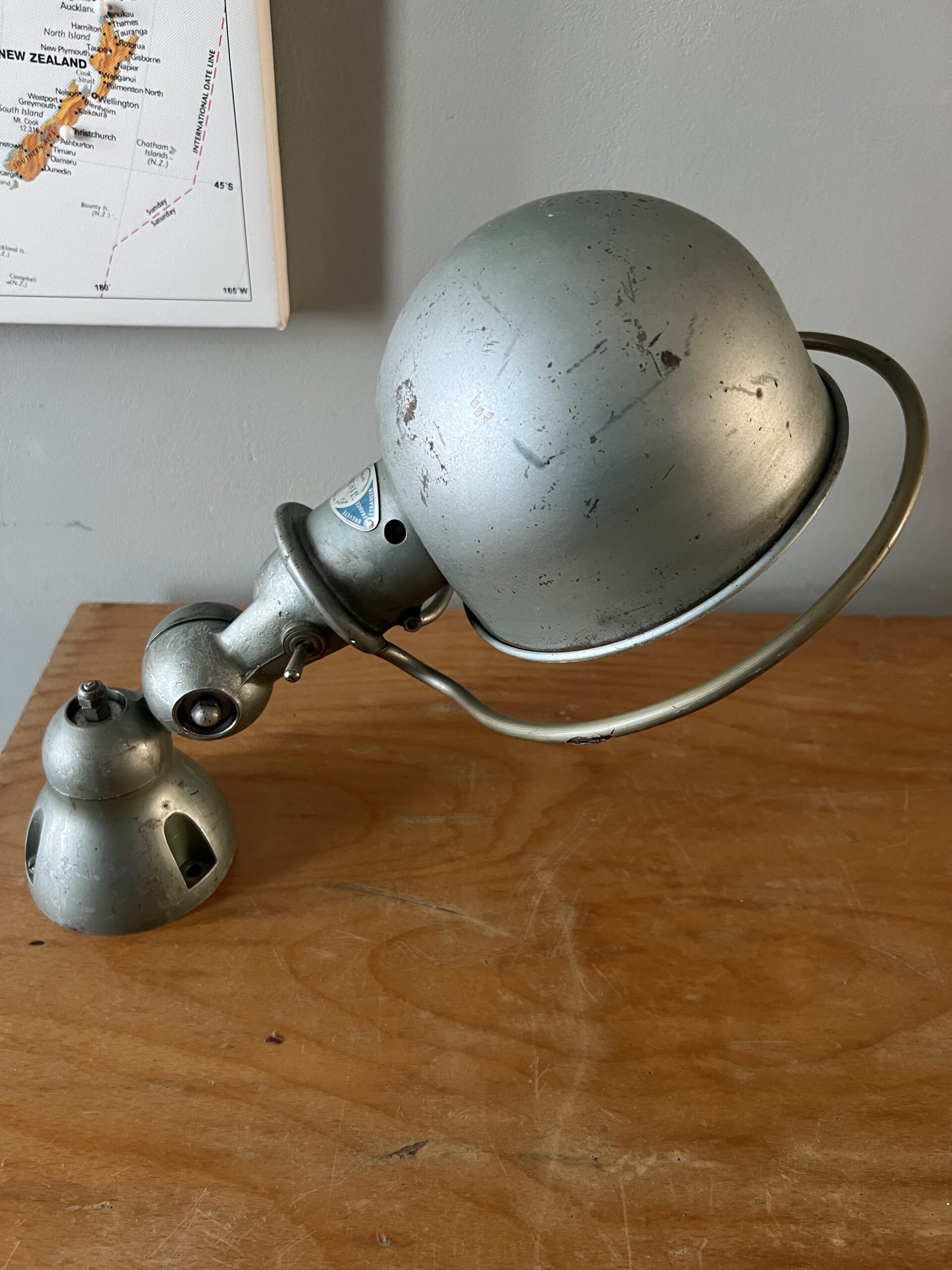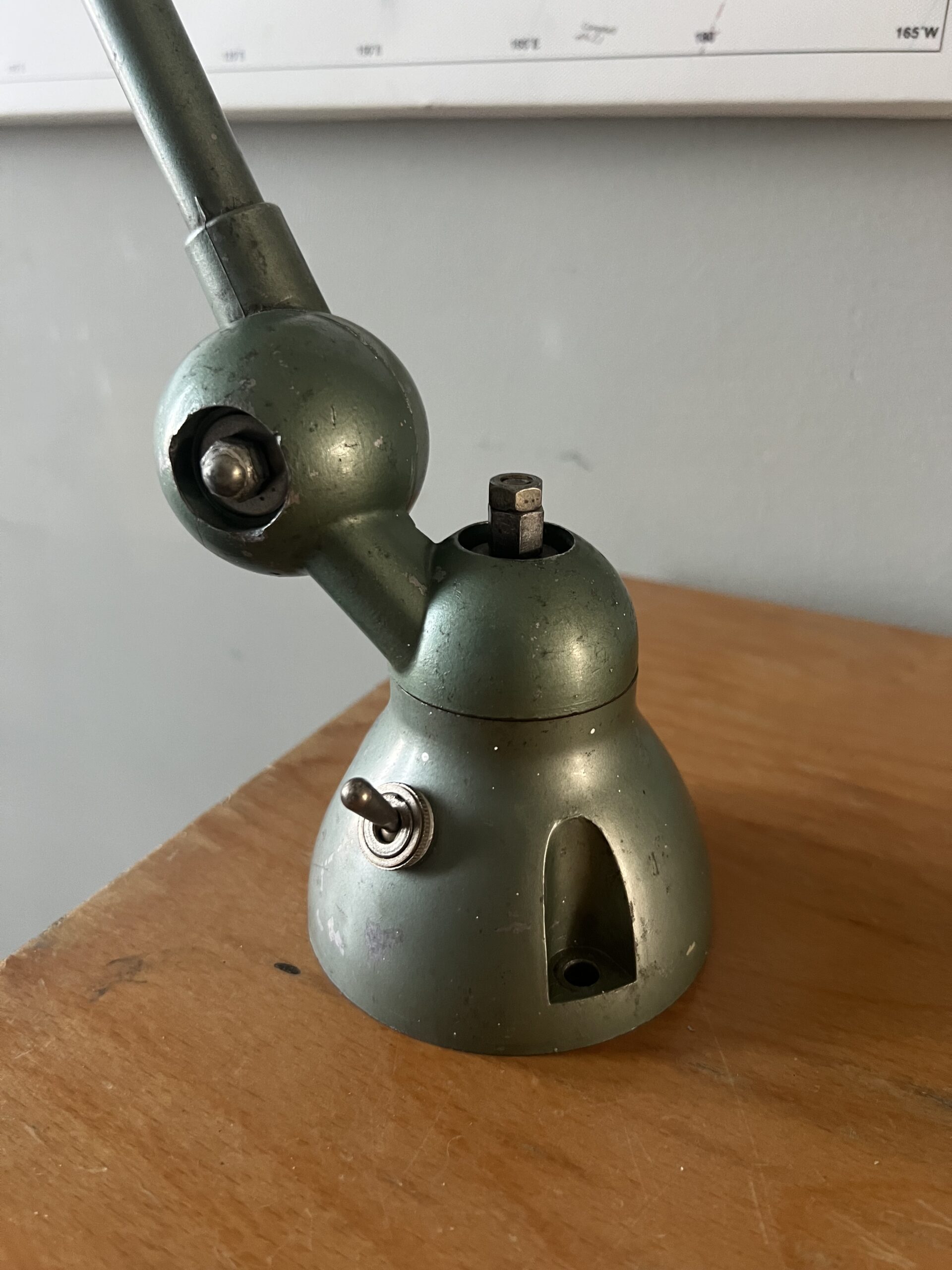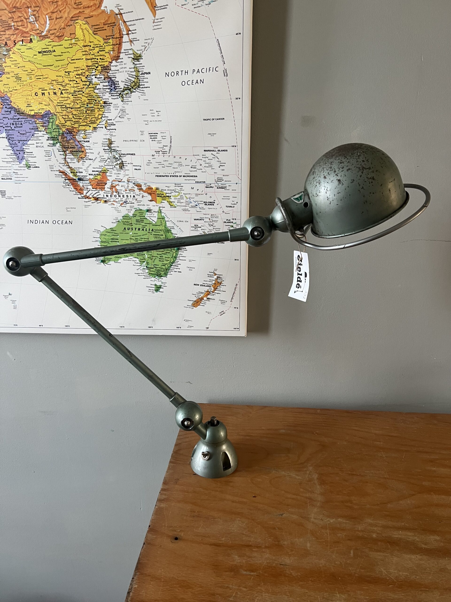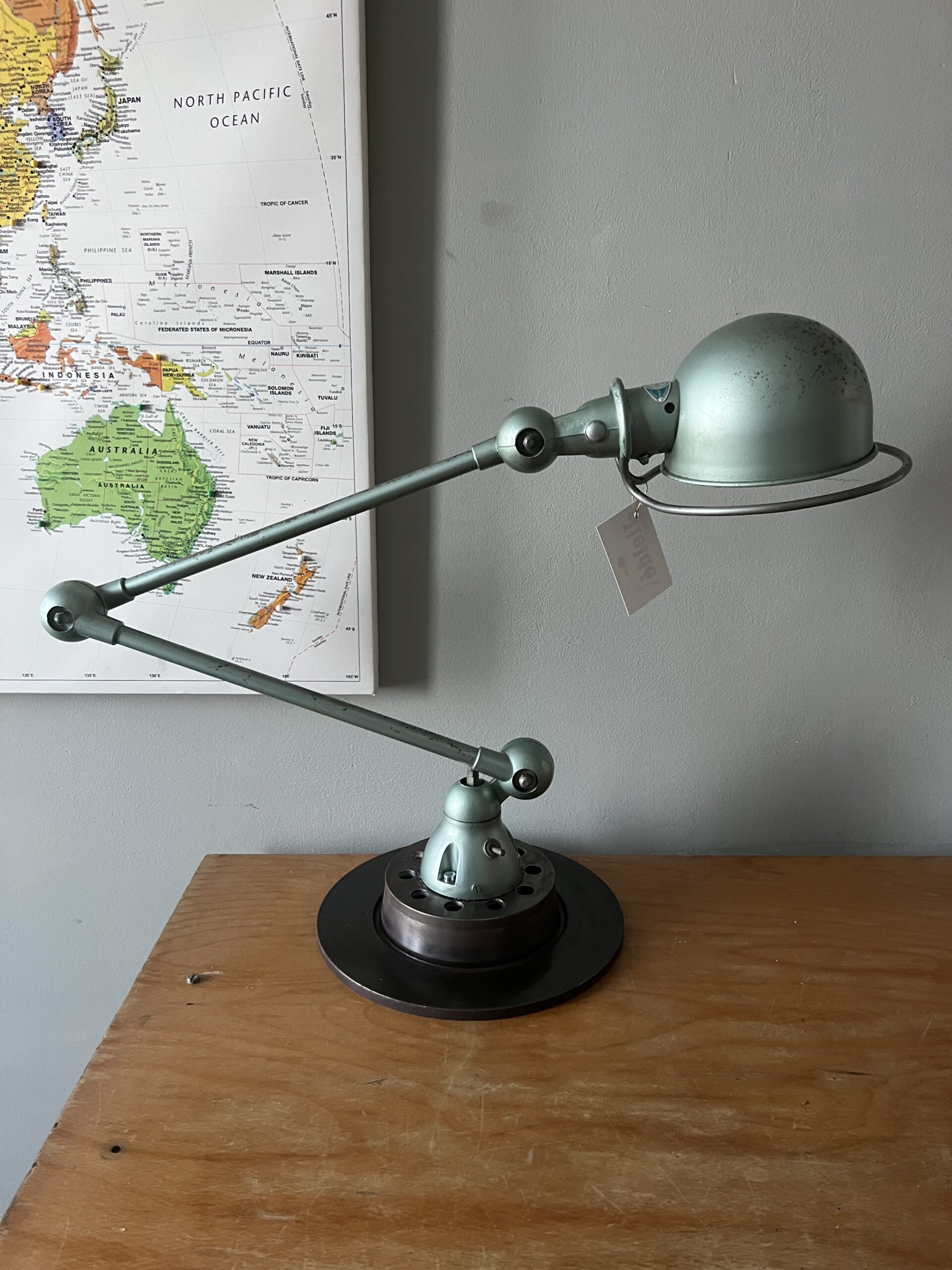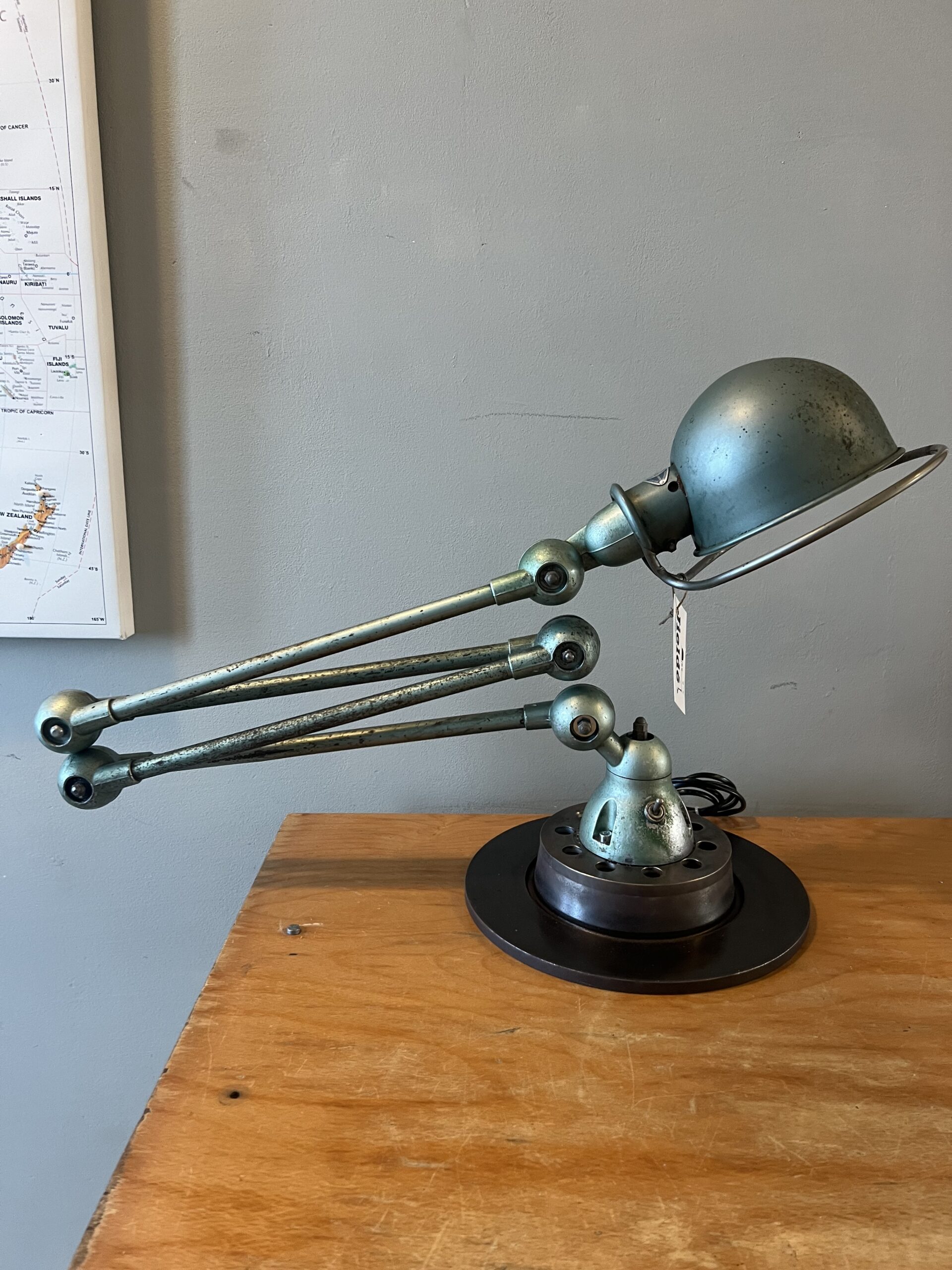 397 Jieldé bureau lamp, twee armen, in de originele Vespa groene kleur. Geheel in originele staat, mooie patina. Met een keramische E27 fitting, een metalen druppelschakelaar op de voet en een groen aluminium etiket, de lamp is dus uit de eerste periode 1950-1960. INCLUSIEF INDUSTRIËLE REMSCHIJF ALS VOET. VENDU