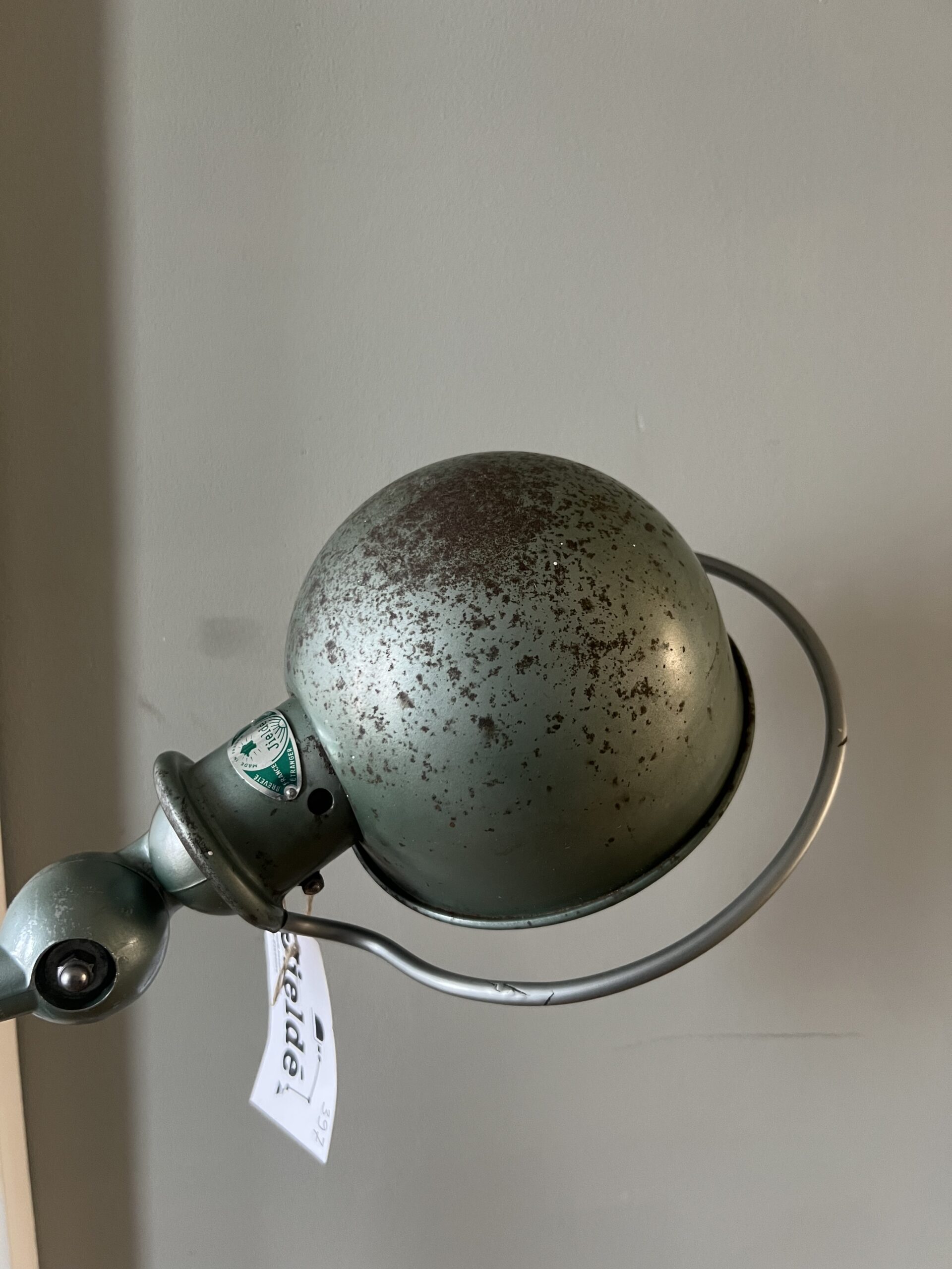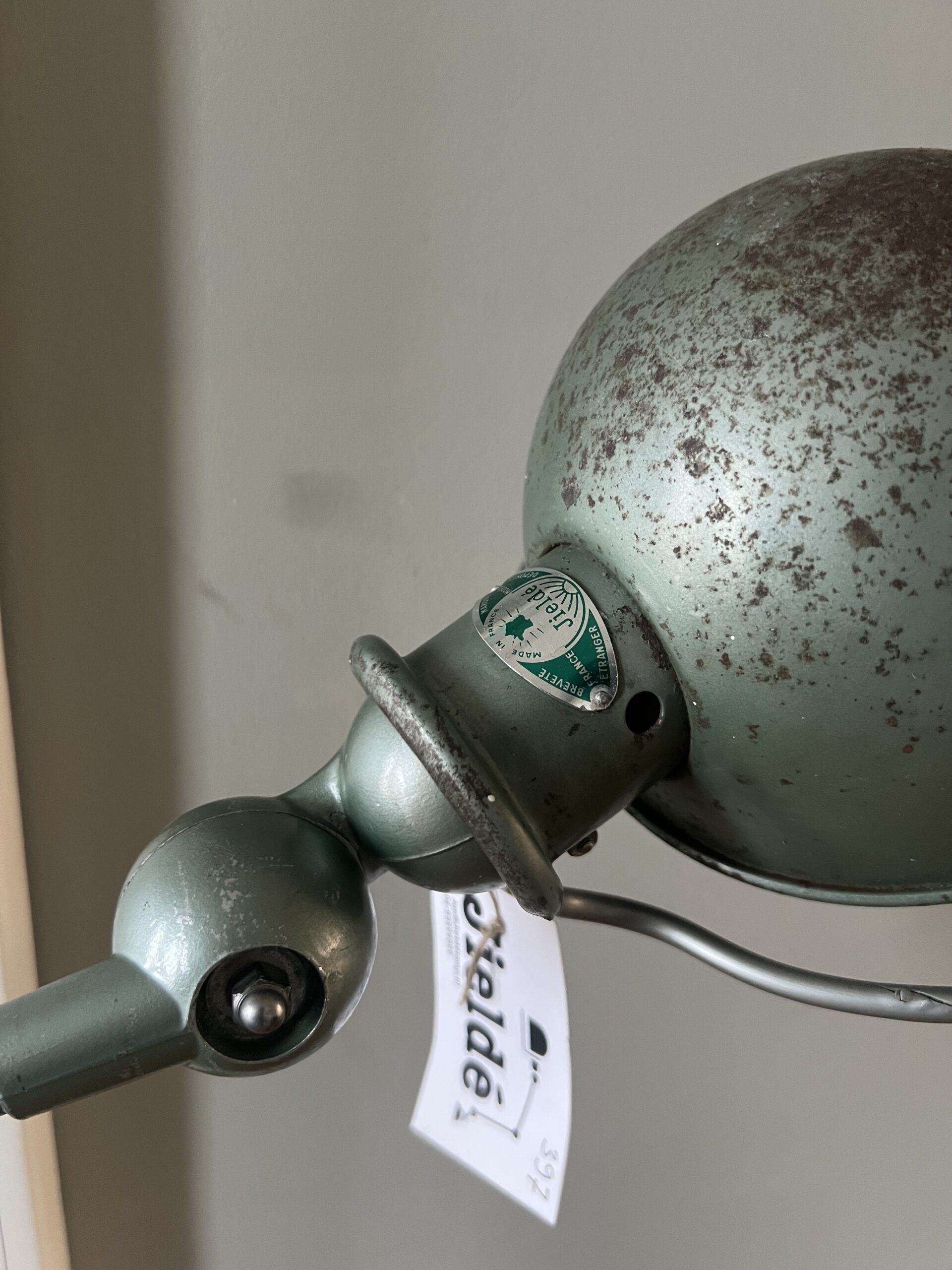 403 Jieldé lamp, mooie patina. Met twee armen in de originele Vespa groene kleur. Met een keramische E27 fitting en een metalen druppelschakelaar. Geplaatst op een industriële remschijf als voet. Met een groen aluminium etiket, de lamp is dus uit de eerste periode 1950-1960. De lamp is door de tijd en door het gebruik geworden zoals hij nu is, een uniek exemplaar. € 295,00