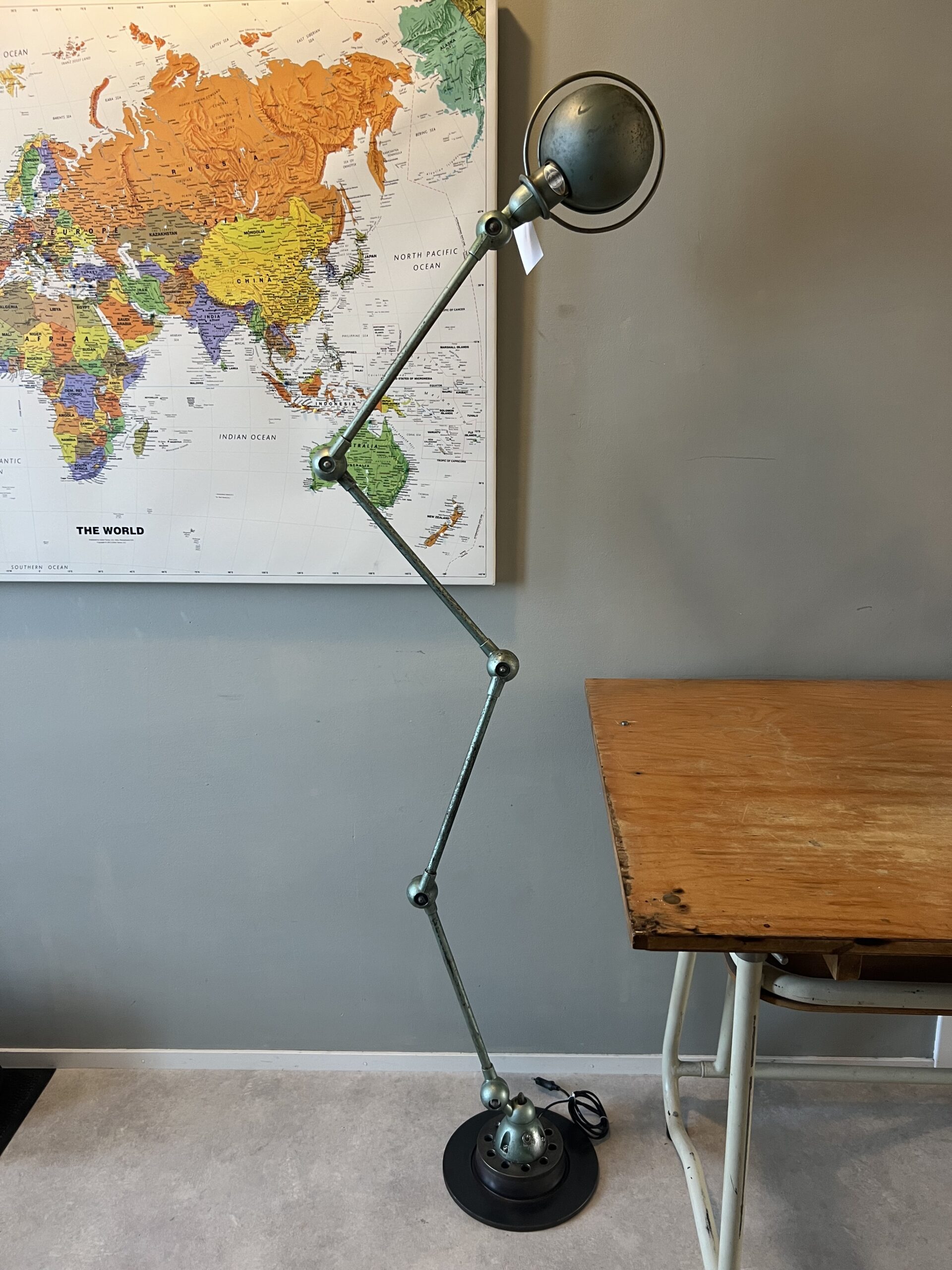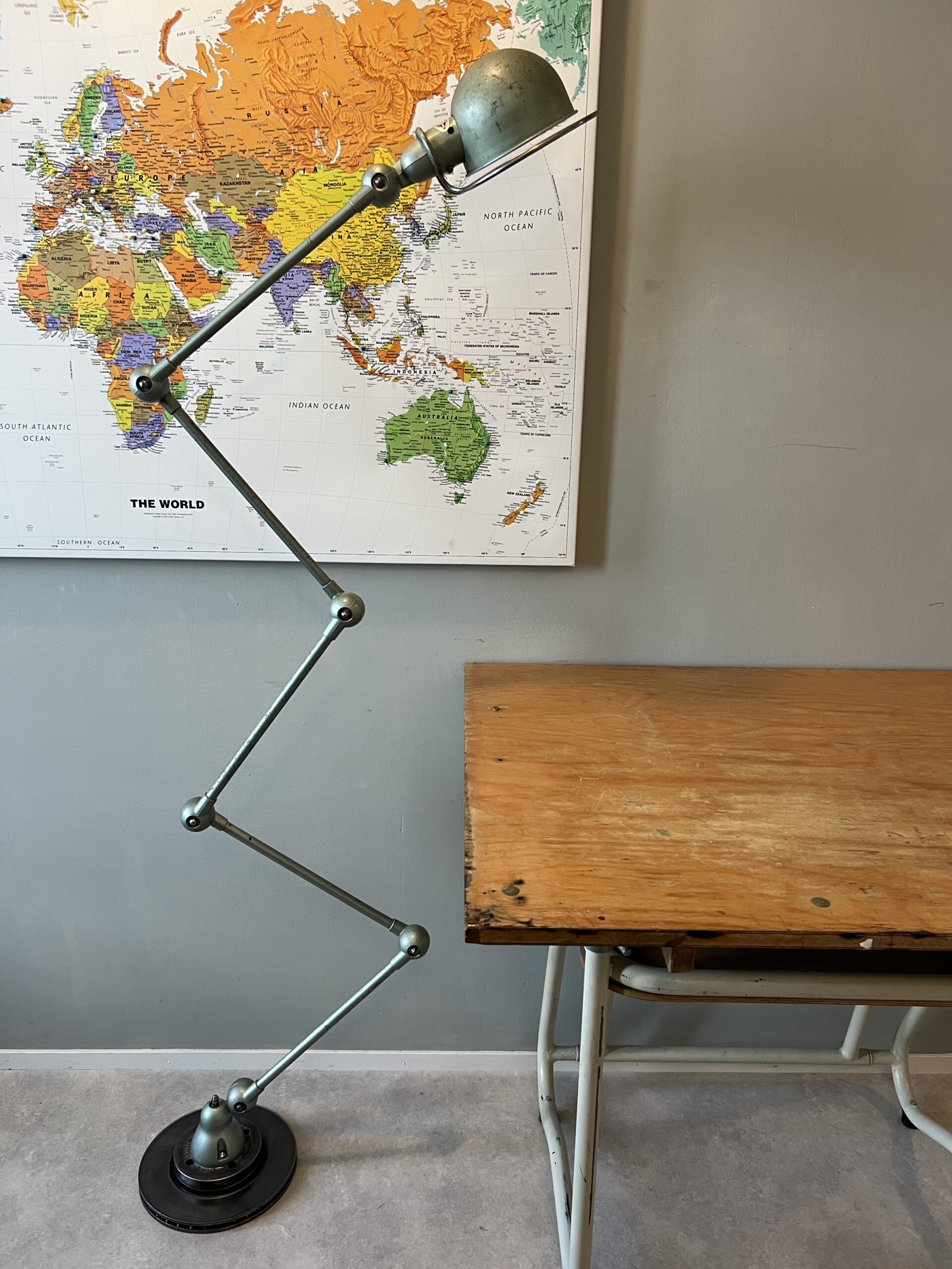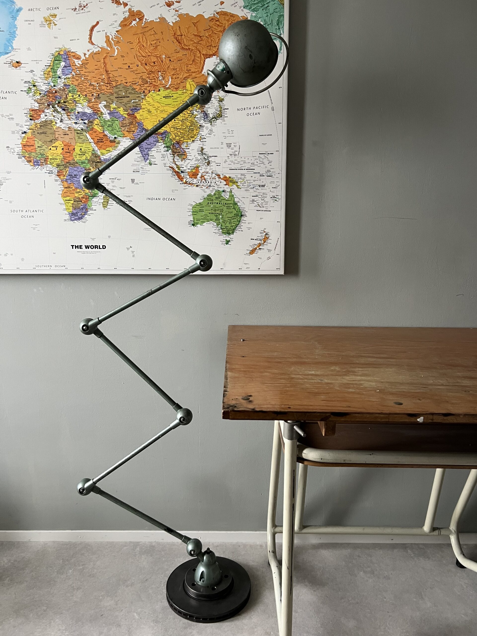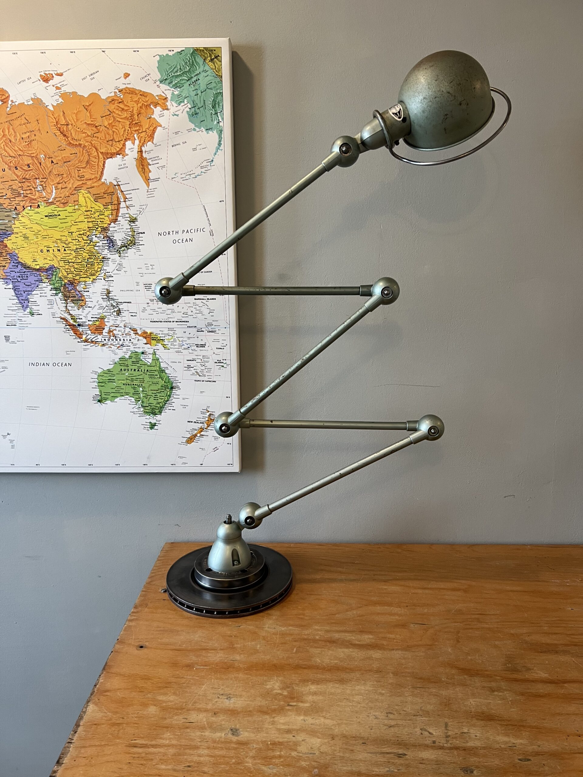 415 Jieldé bureau, tafellamp met twee armen, In de originele lichtgrijze kleur.Met een keramische “normale” E27 fitting en een metalen druppelschakelaar op de fittinghouder bij de bol. INCLUSIEF INDUSTRIËLE REMSCHIJF ALS VOET. Met een zwart label. Lamp is uit de periode 1980. € 295,00