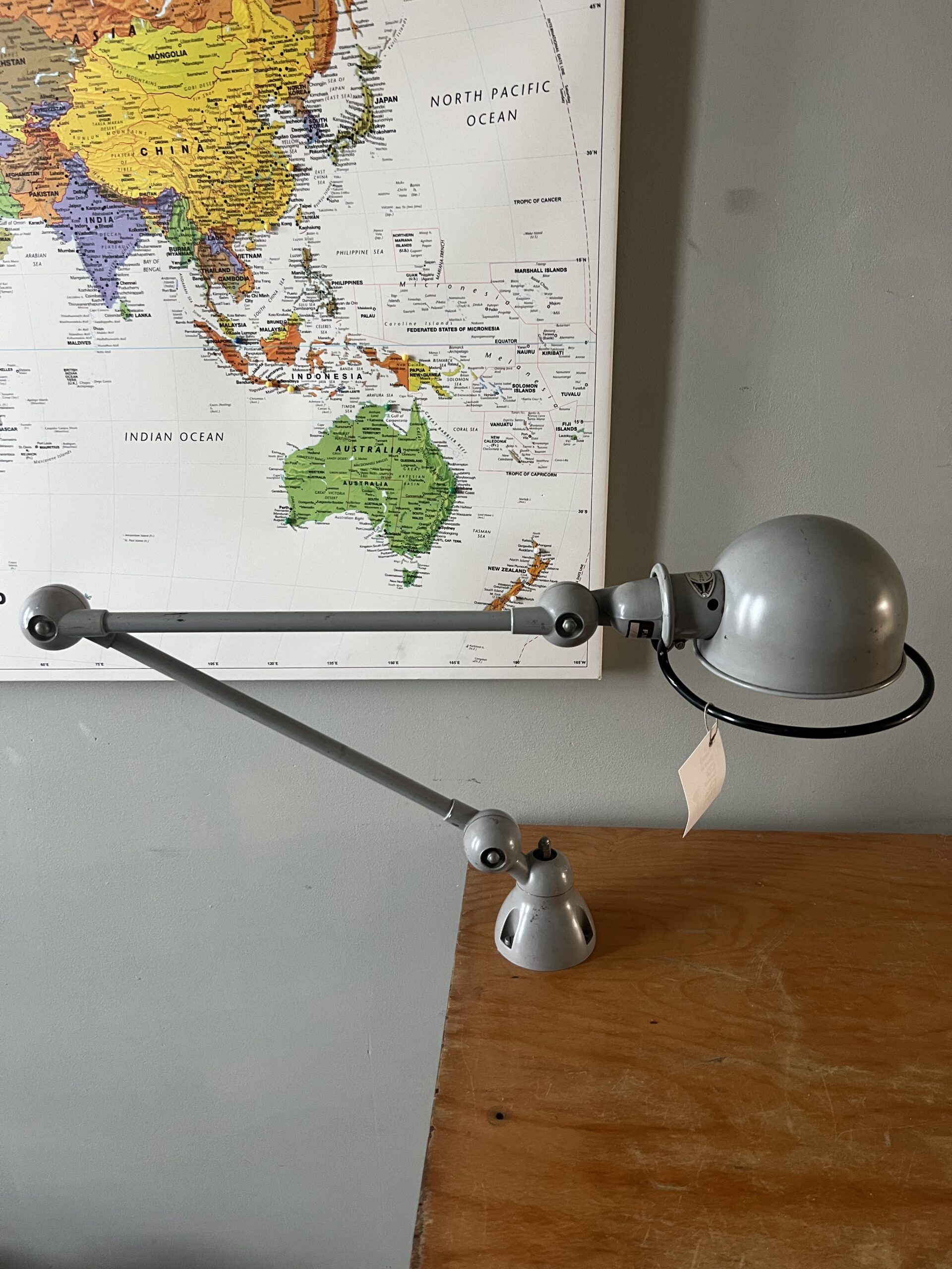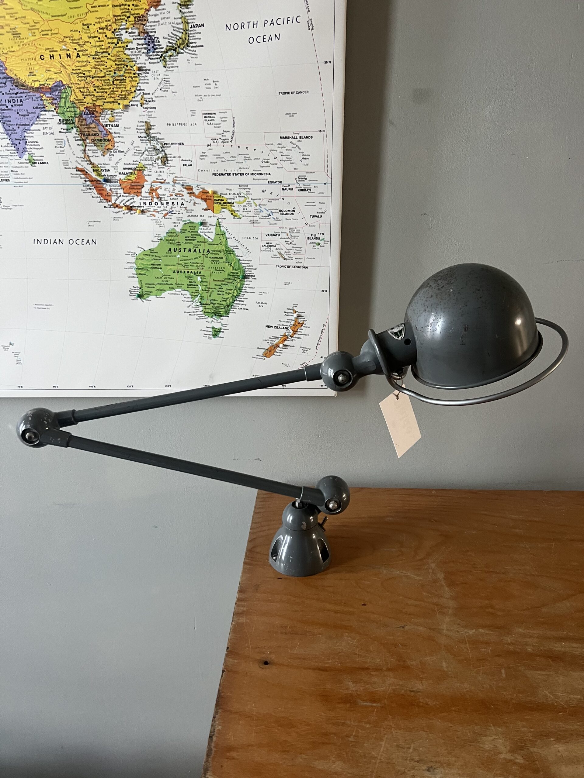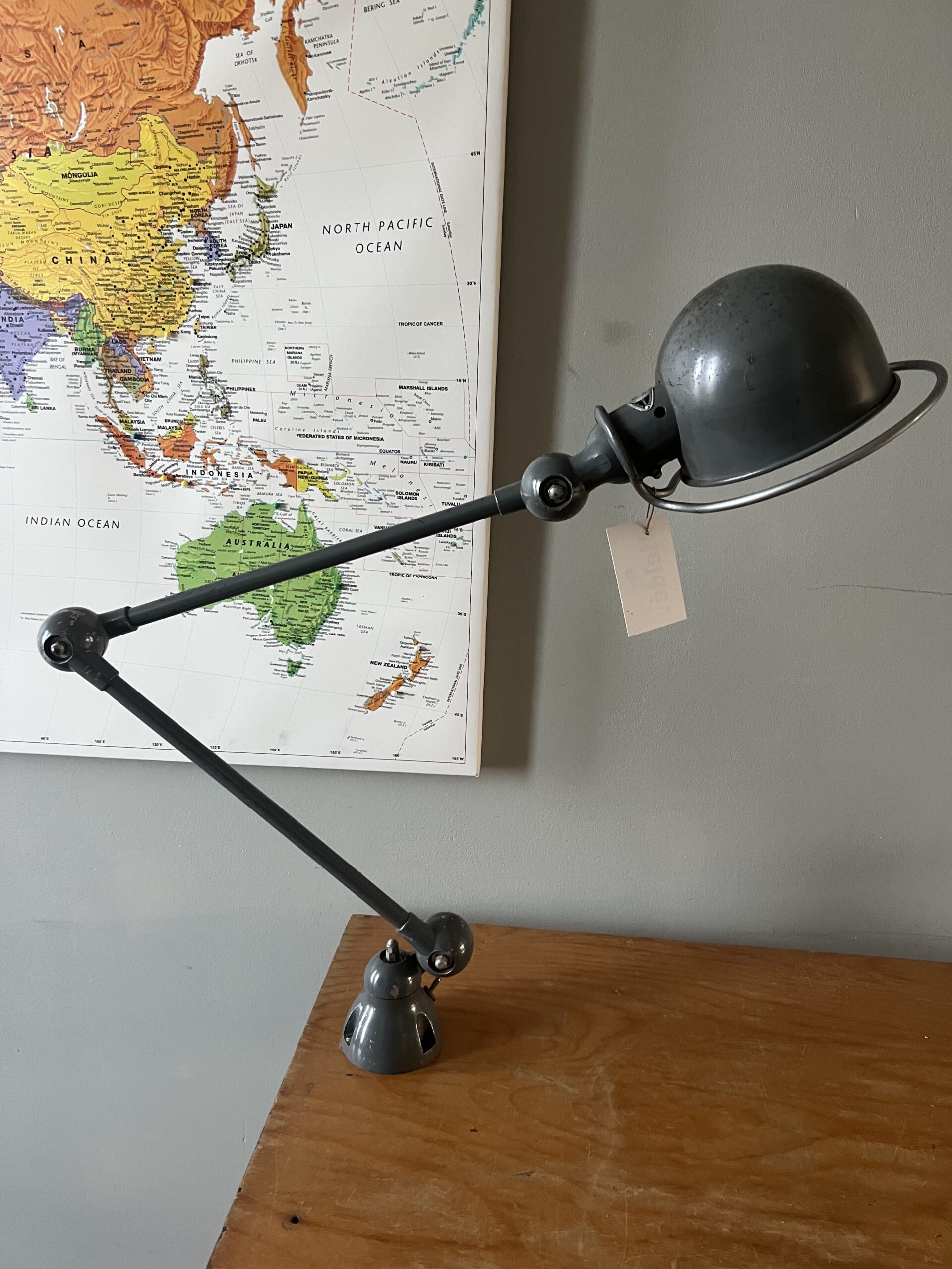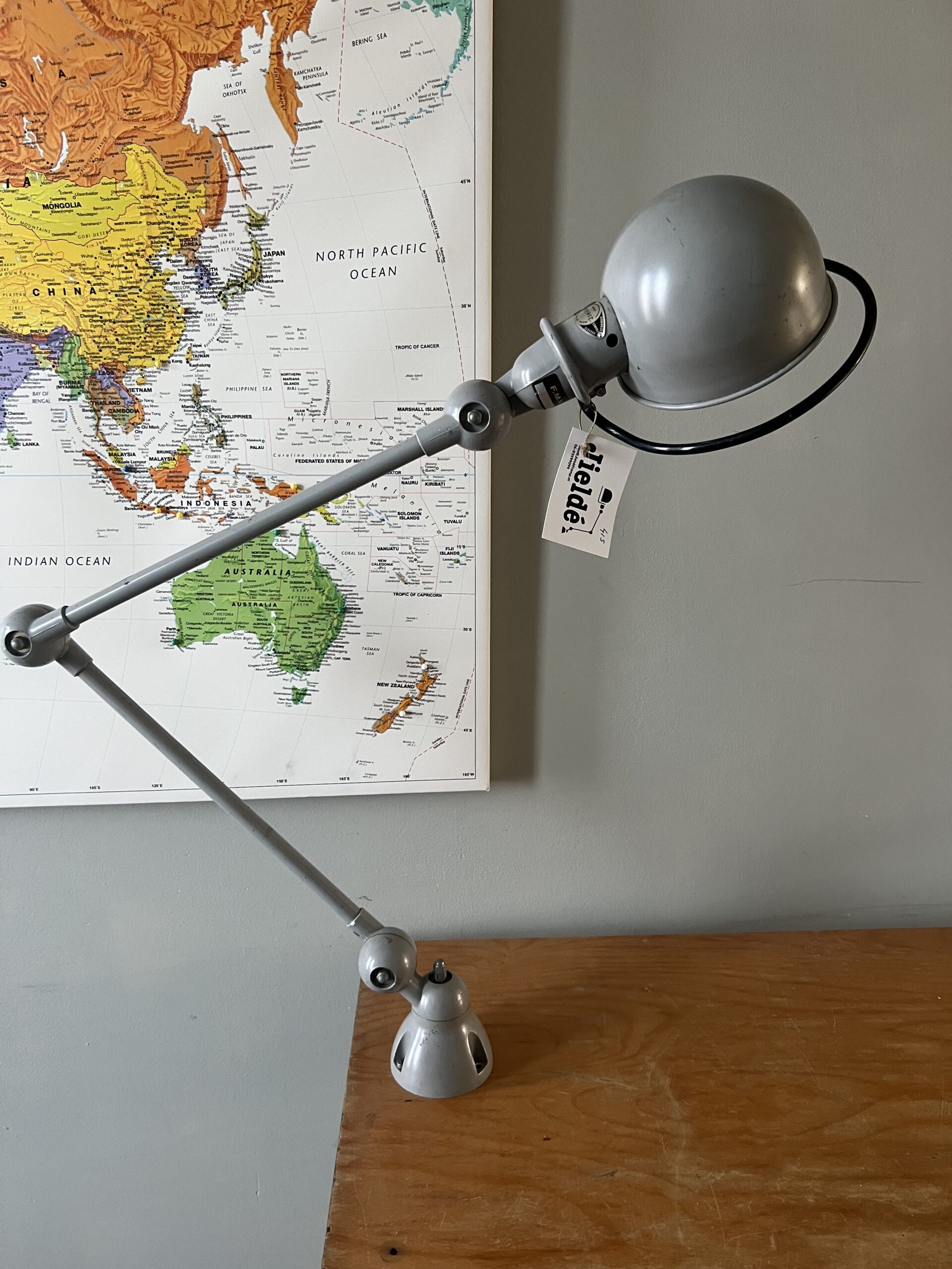 415 Jieldé bureau, tafellamp met twee armen, In de originele lichtgrijze kleur.Met een keramische “normale” E27 fitting en een metalen druppelschakelaar op de fittinghouder bij de bol. INCLUSIEF INDUSTRIËLE REMSCHIJF ALS VOET. Met een zwart label. Lamp is uit de periode 1980. € 295,00
