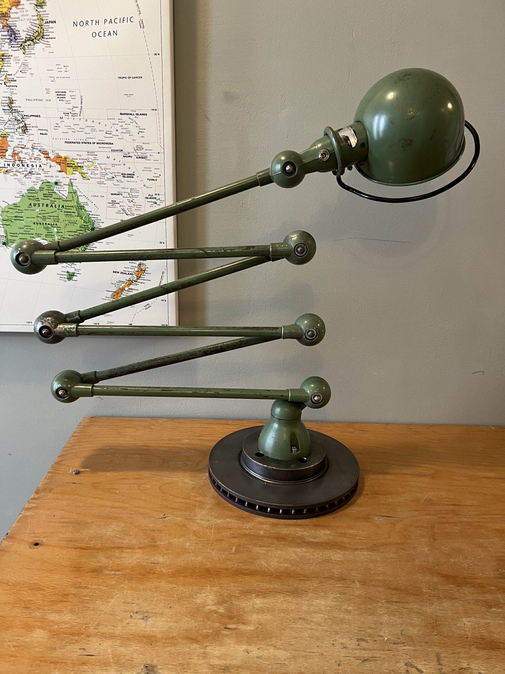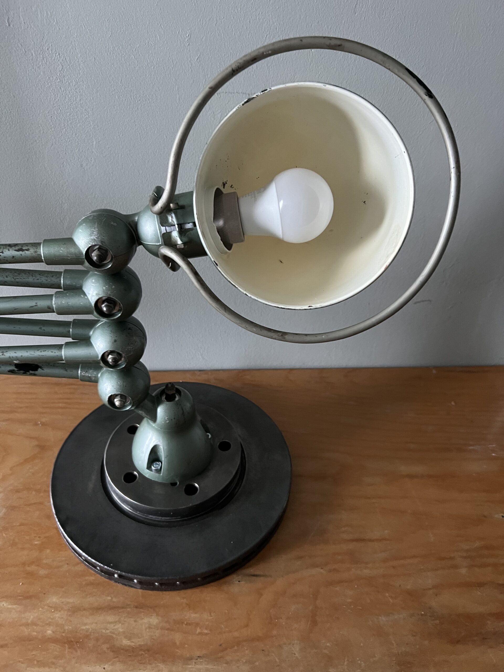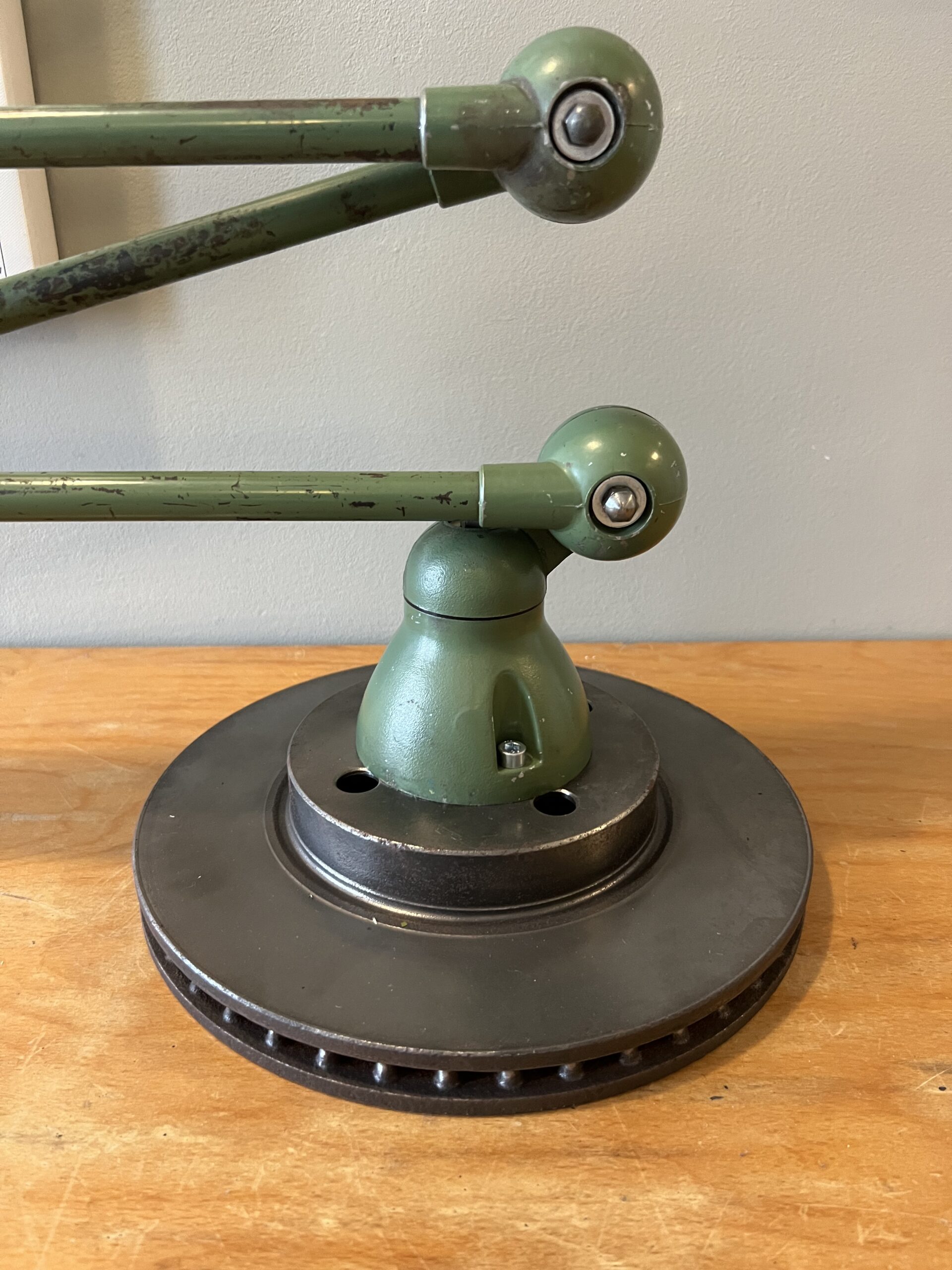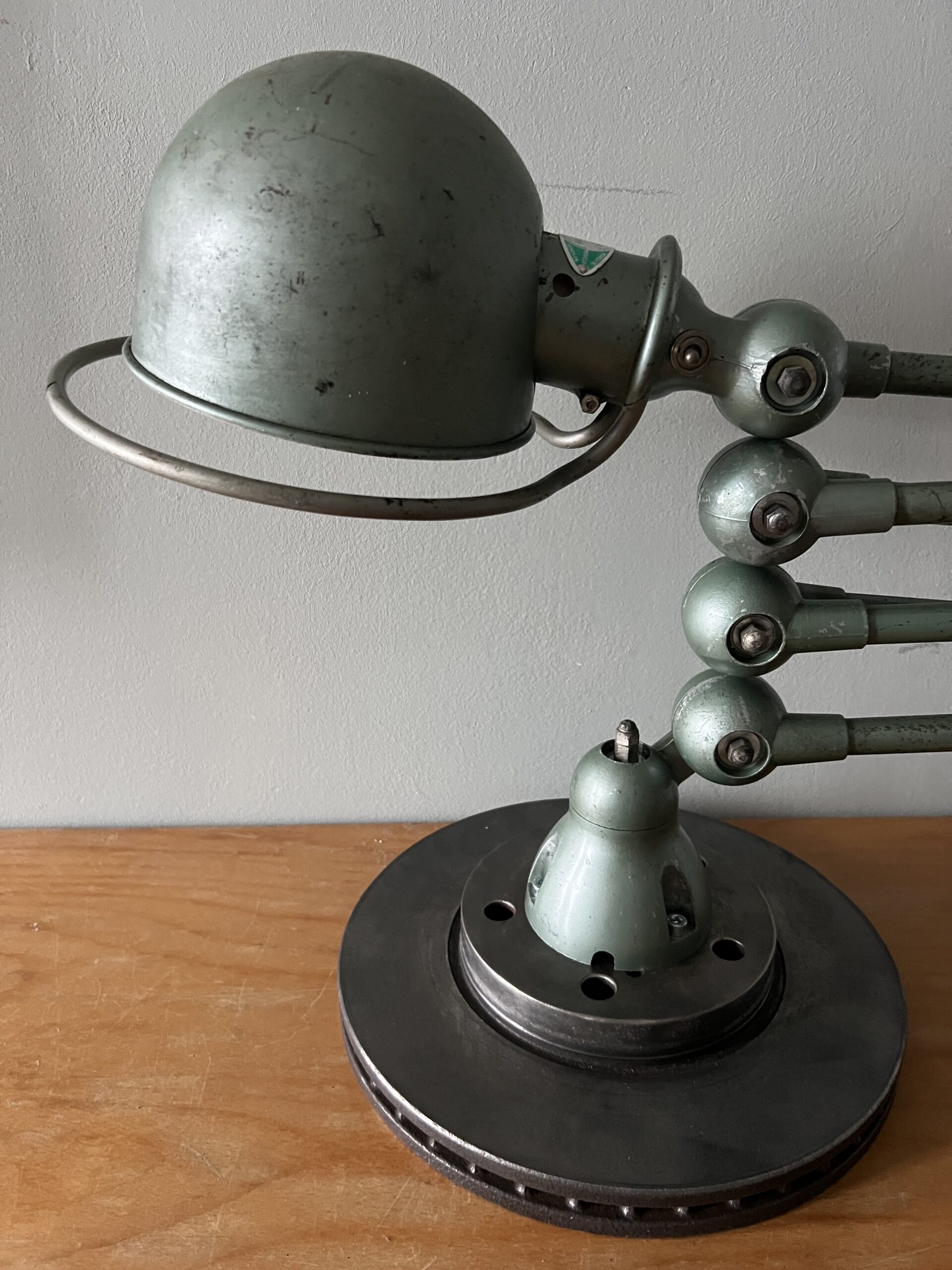 413 Jieldé lamp met twee armen in de originele Vespa groene kleur. Met een keramische E27 fitting en een metalen druppelschakelaar op de voet. Geplaatst op een industriële remschijf als voet. Met een blauw etiket, de lamp is dus uit de eerste periode 1950-1960. VENDU