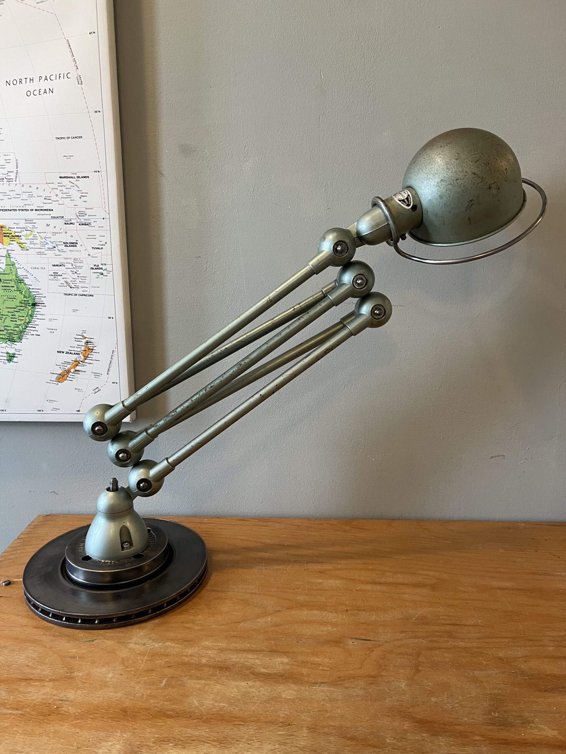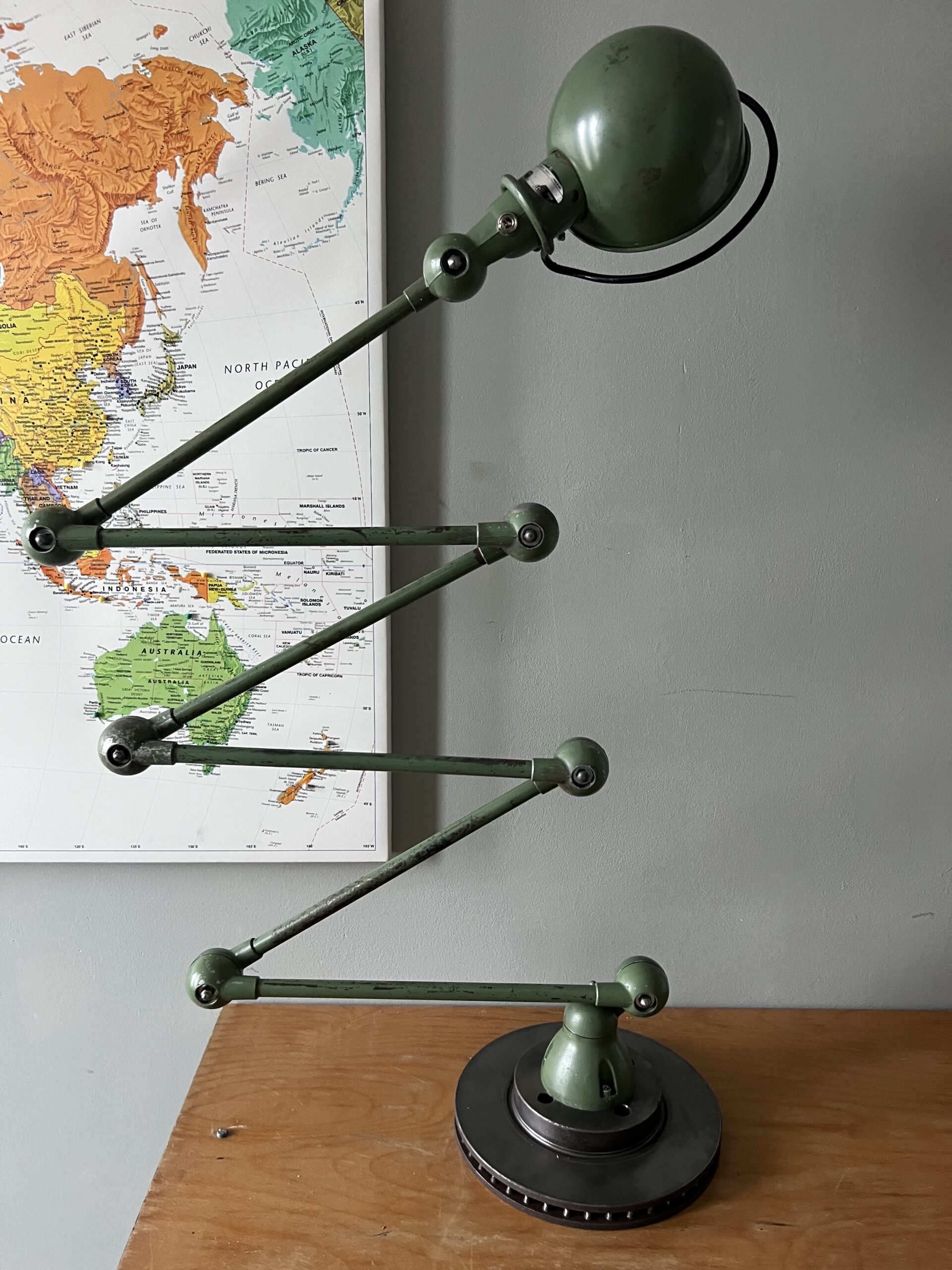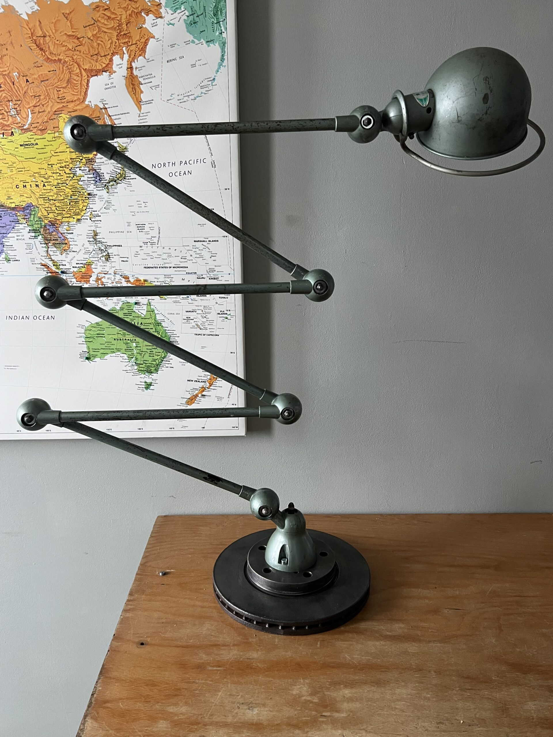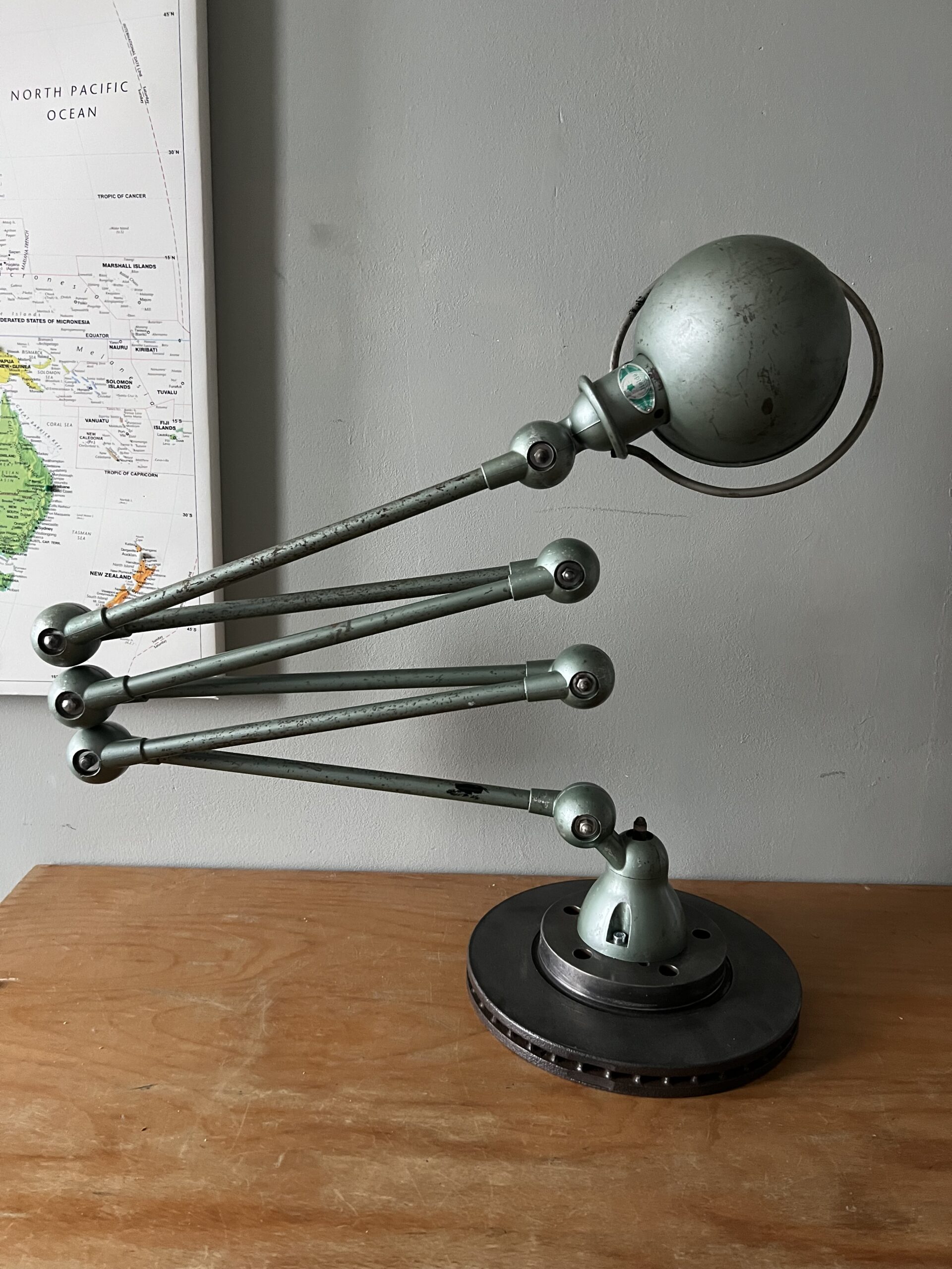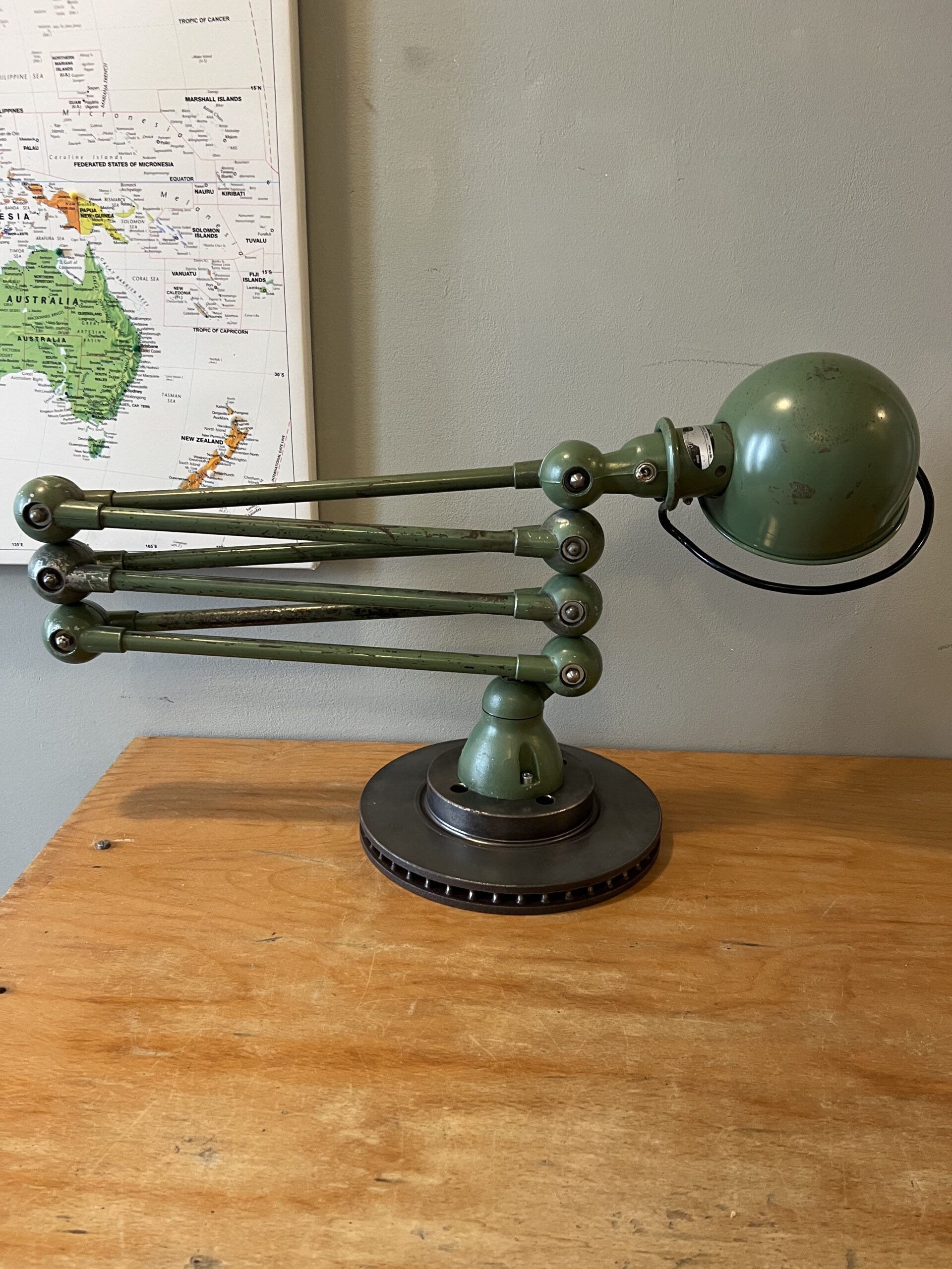 413 Jieldé lamp met twee armen in de originele Vespa groene kleur. Met een keramische E27 fitting en een metalen druppelschakelaar op de voet. Geplaatst op een industriële remschijf als voet. Met een blauw etiket, de lamp is dus uit de eerste periode 1950-1960. VENDU