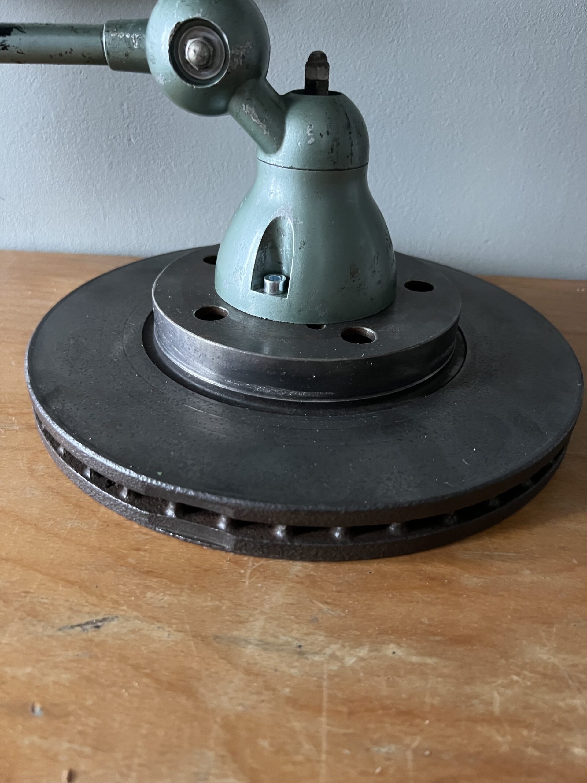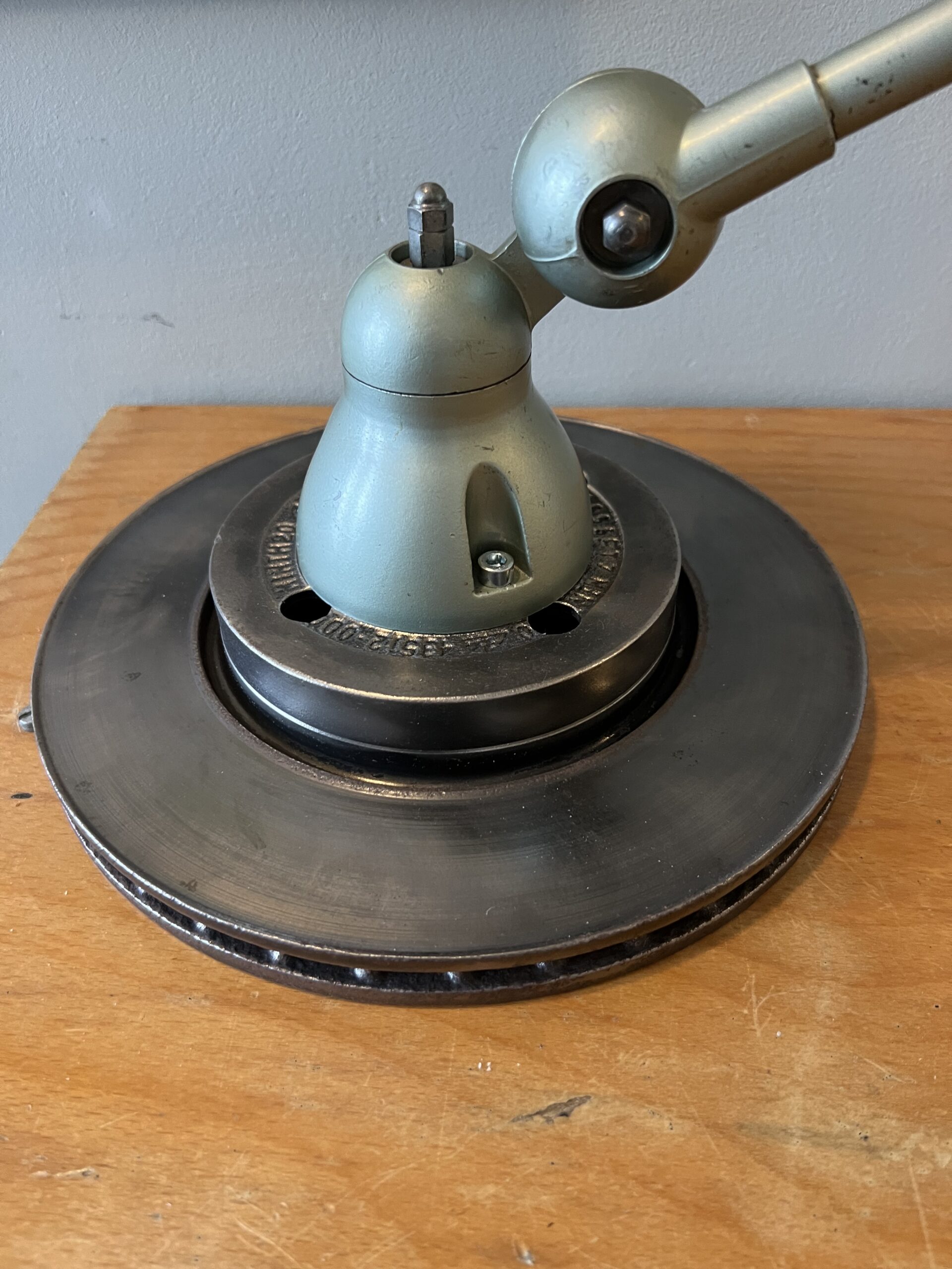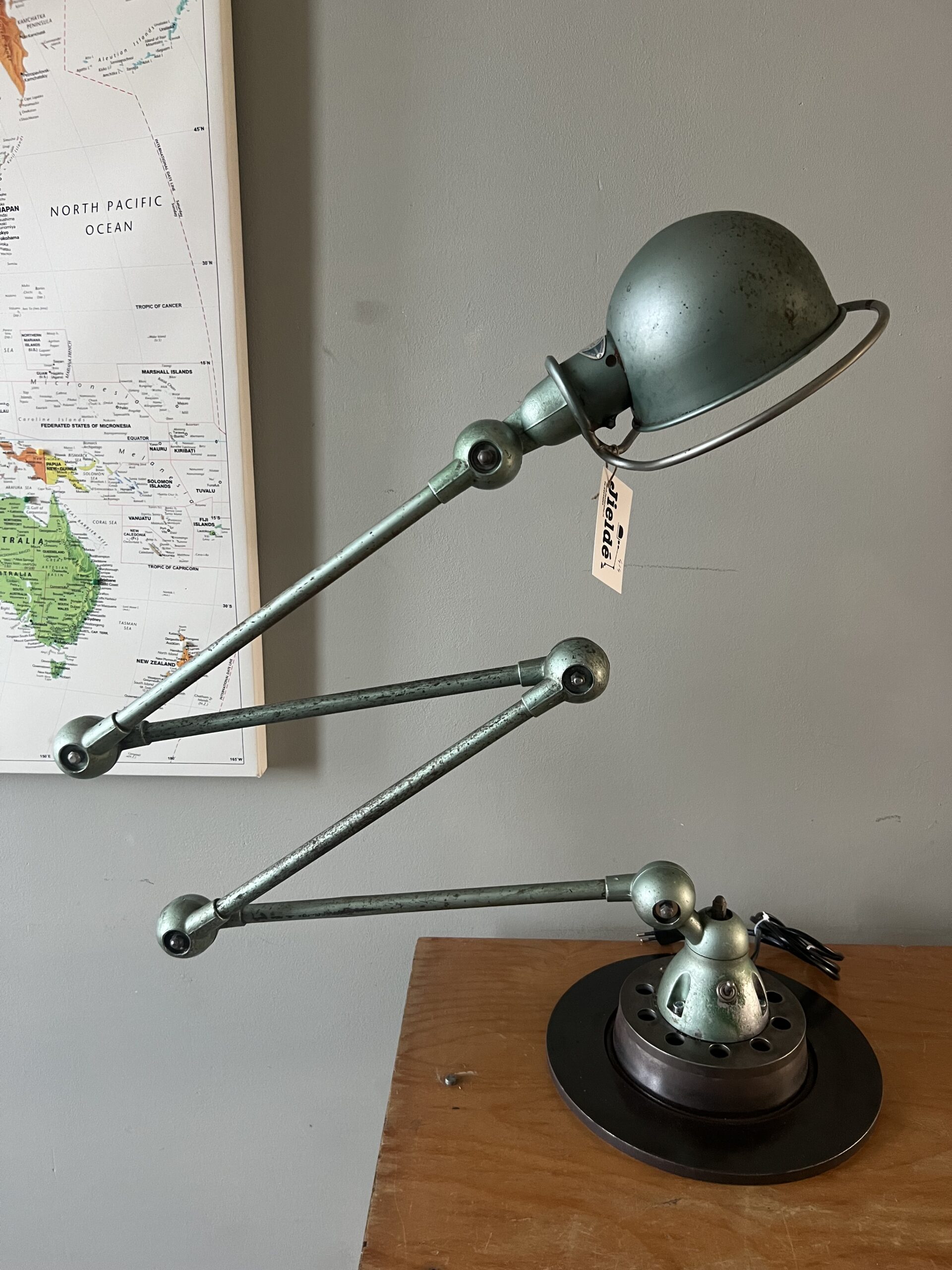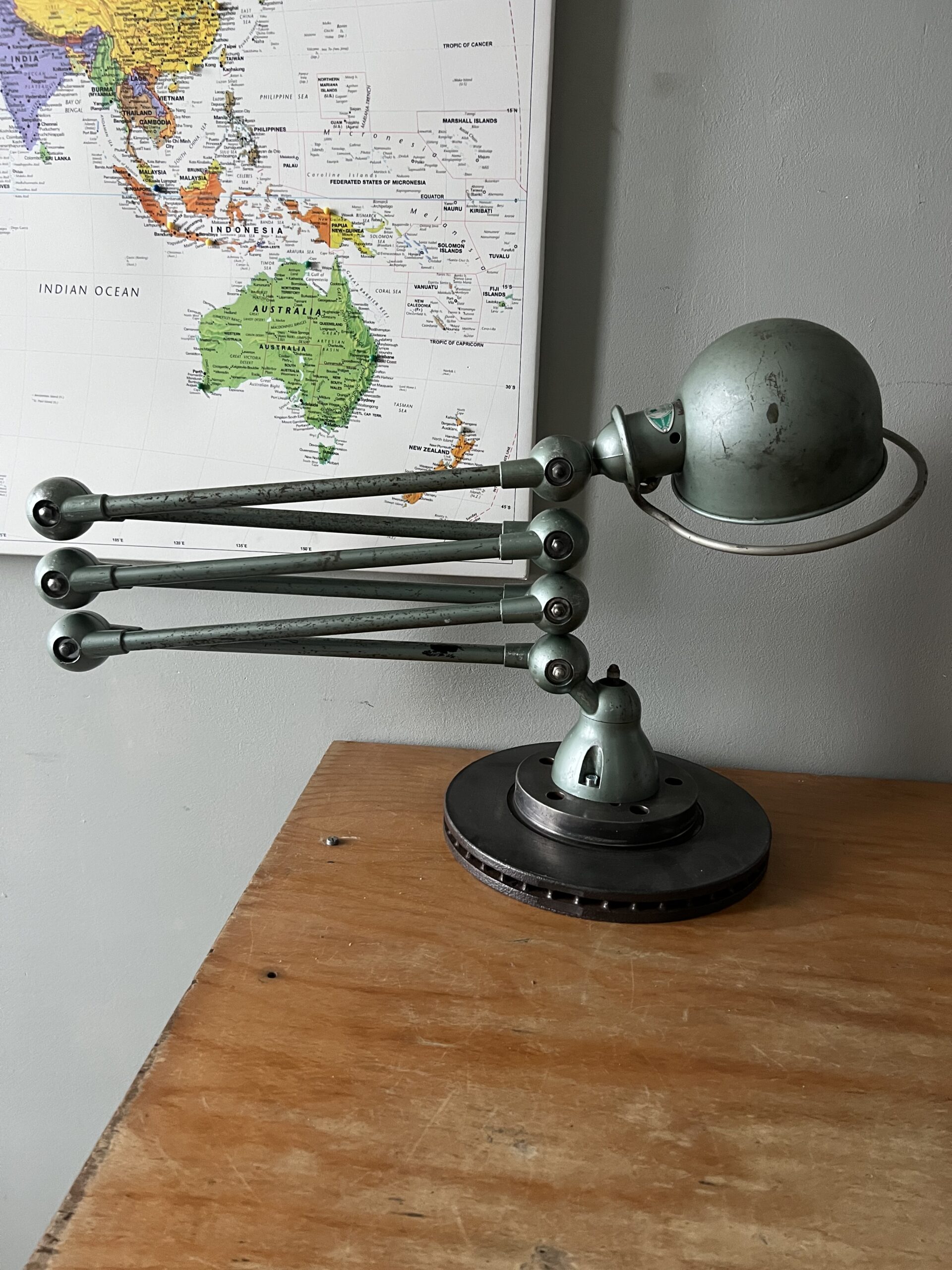 413 Jieldé lamp met twee armen in de originele Vespa groene kleur. Met een keramische E27 fitting en een metalen druppelschakelaar op de voet. Geplaatst op een industriële remschijf als voet. Met een blauw etiket, de lamp is dus uit de eerste periode 1950-1960. VENDU