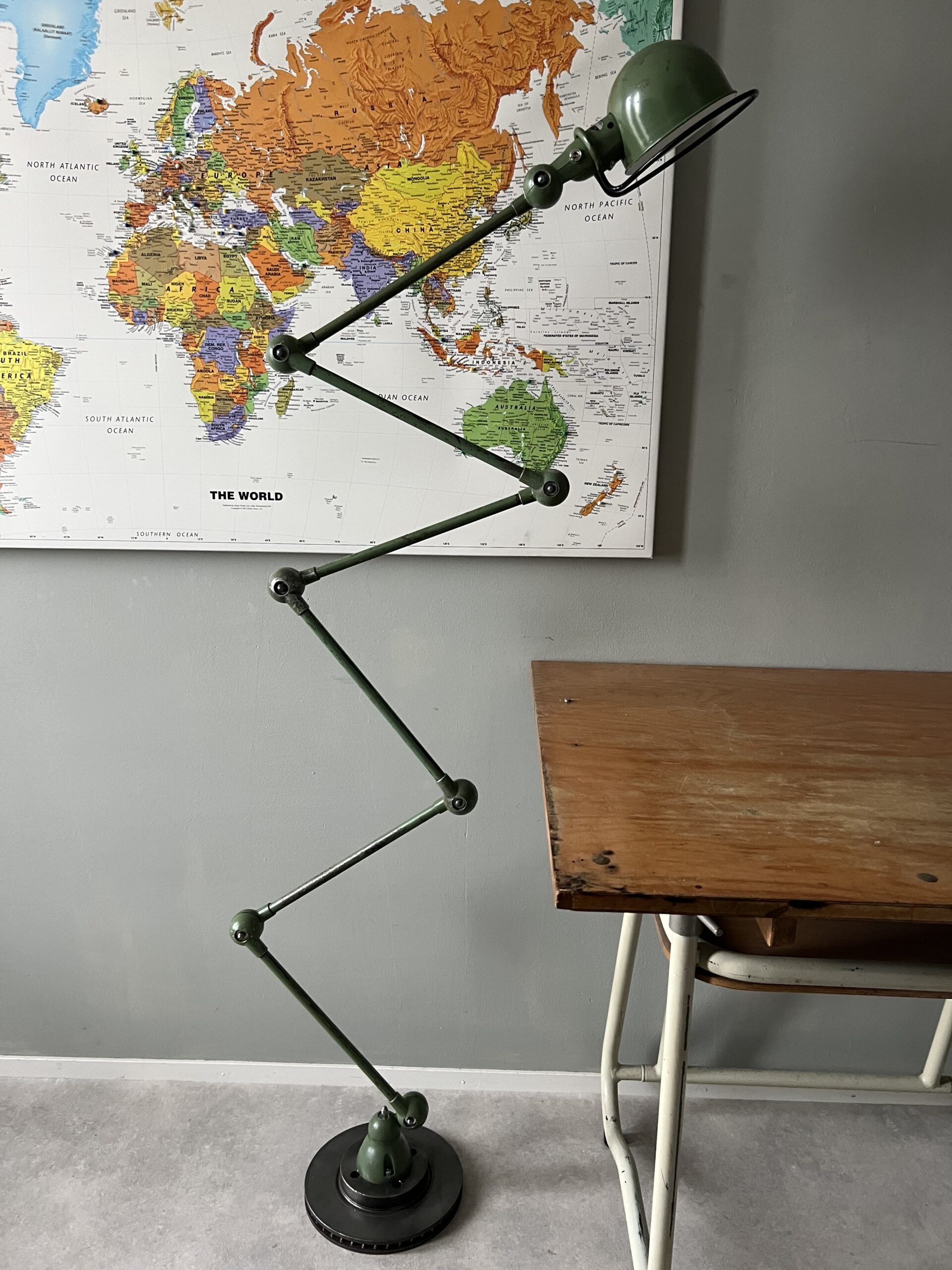 420 Jieldé vloerlamp, zes armen, in de originele werkplaats kleur Olijf groen. De lamp is door de tijd en door het gebruik geworden zoals hij nu is, een industrieel vintage exemplaar. Met een keramische E27 fitting, een metalen druppelschakelaar op de fittinghouder en een origineel zwart etiket. Geplaatst op een industriële remschijf als stevige voet. VENDU