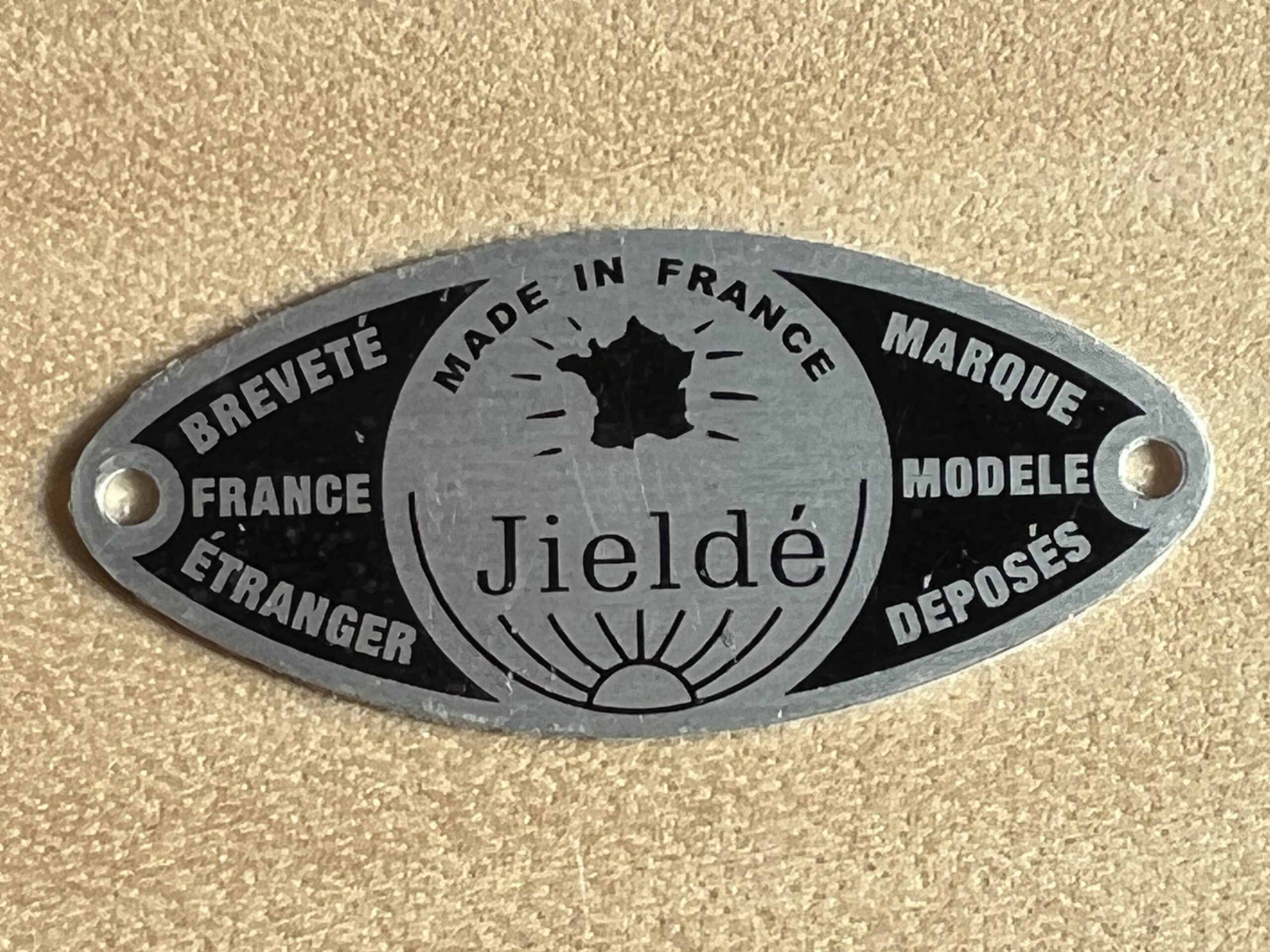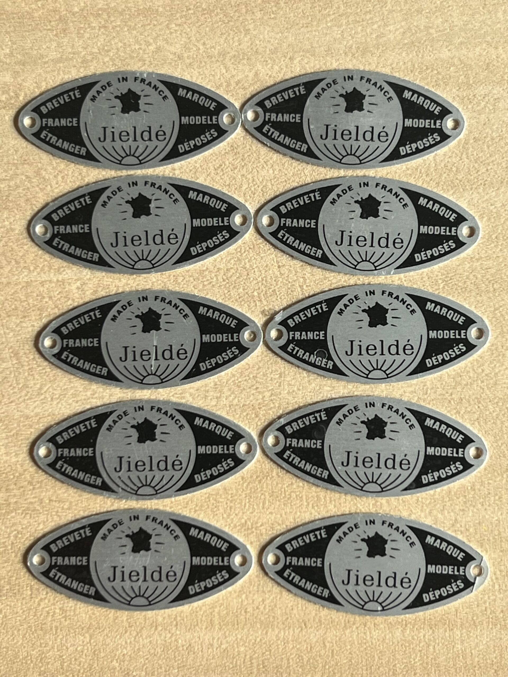 Authentieke aluminium Jieldé label/etiket, inclusief 2 klinknagels. In groen en in zwart leverbaar. De etiketten hebben een beschermfolie om beschadiging te voorkomen. Geschikt voor restauratie of als design object. (Via briefpost € 1,40).