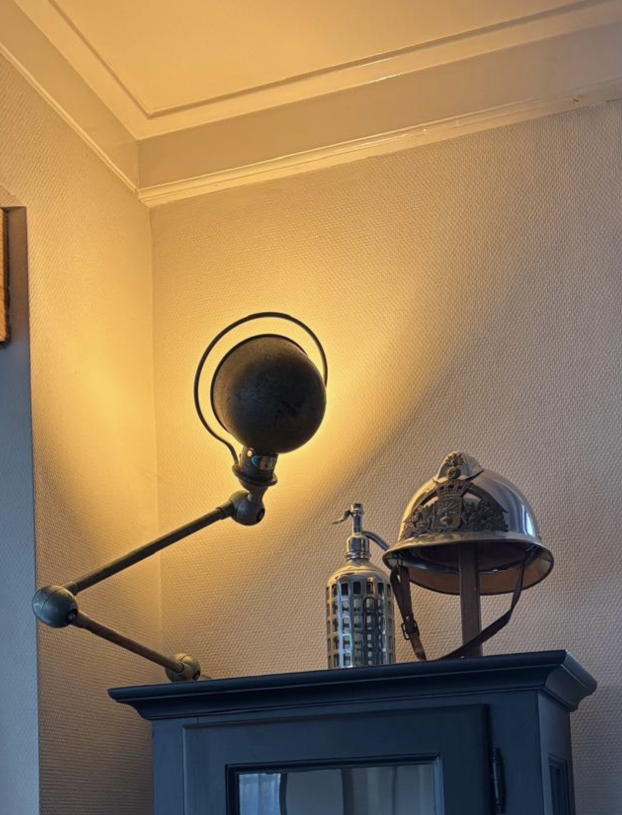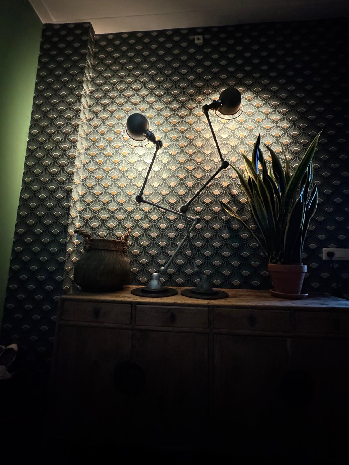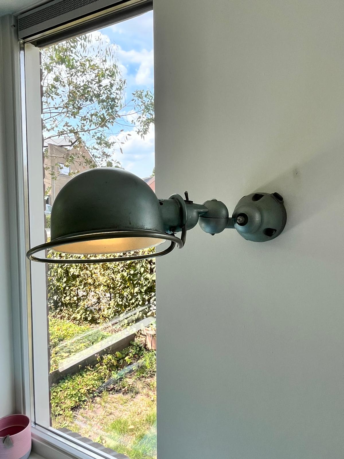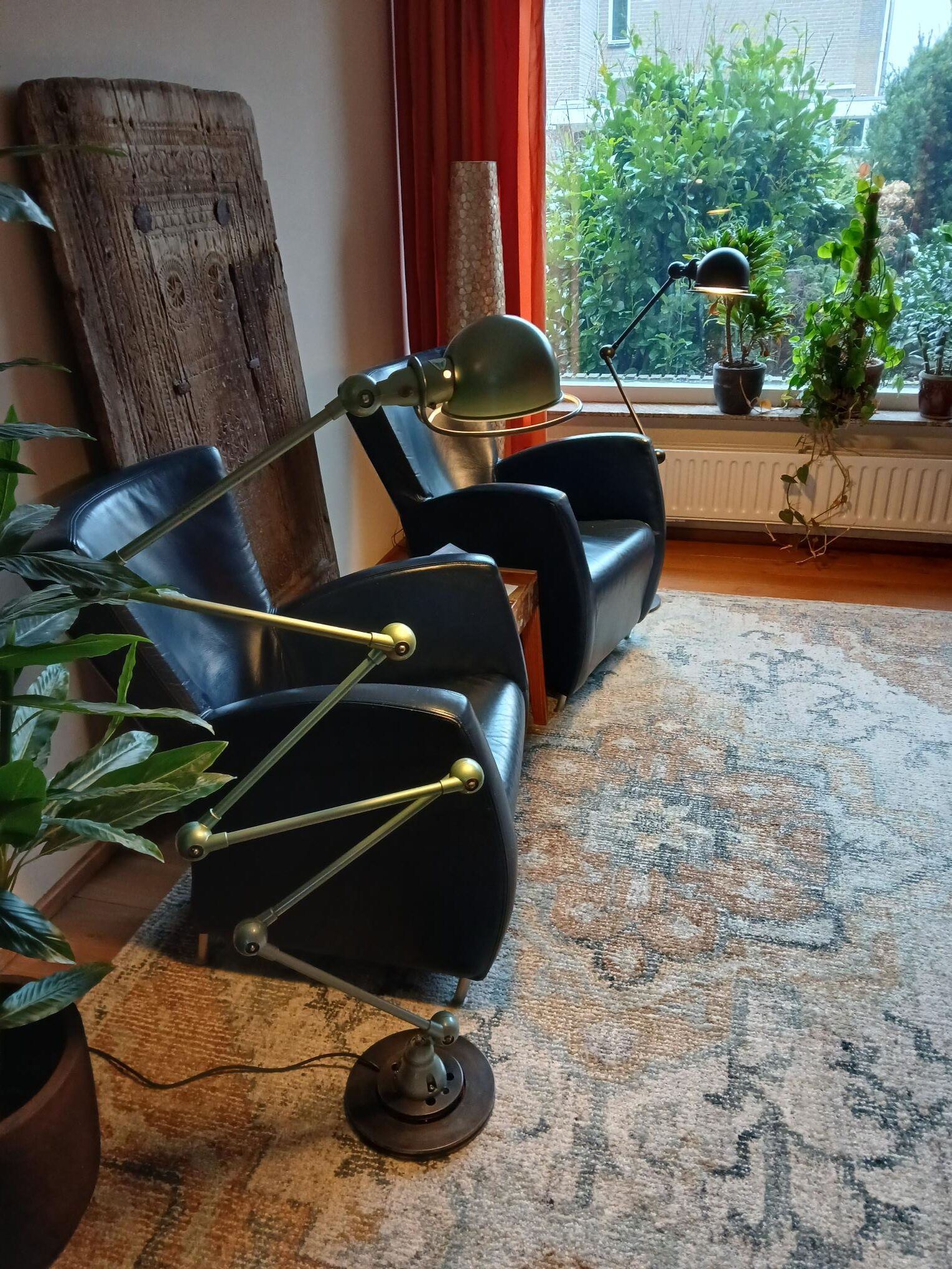 Myriam uit Groningen is helemaal verslingerd aan de Jieldé lampen. Het begon met één en inmiddels zijn het er al drie. Deze olijfgroene lamp heeft 4 armen en is geplaatst op een industriële remschijf als voet. Alle drie hebben ze een mooie plek gevonden. Wellicht komt lamp 4 er ook nog wel……..