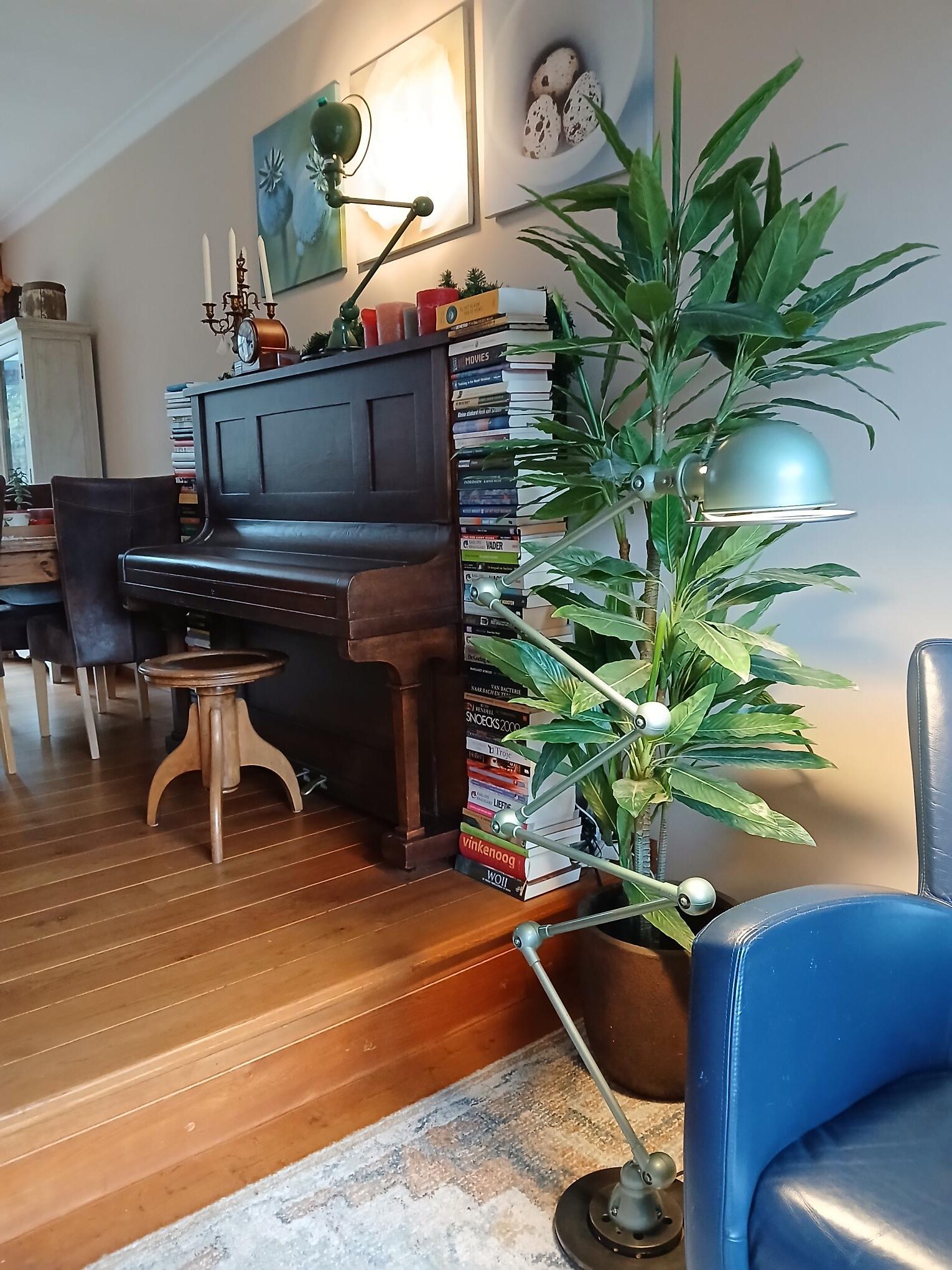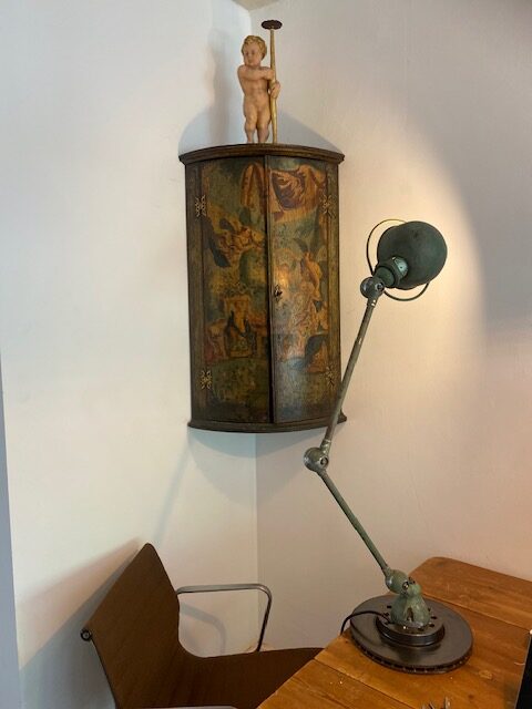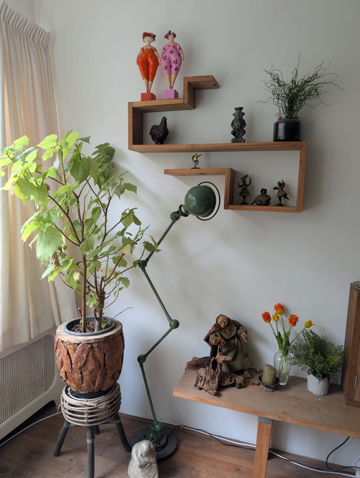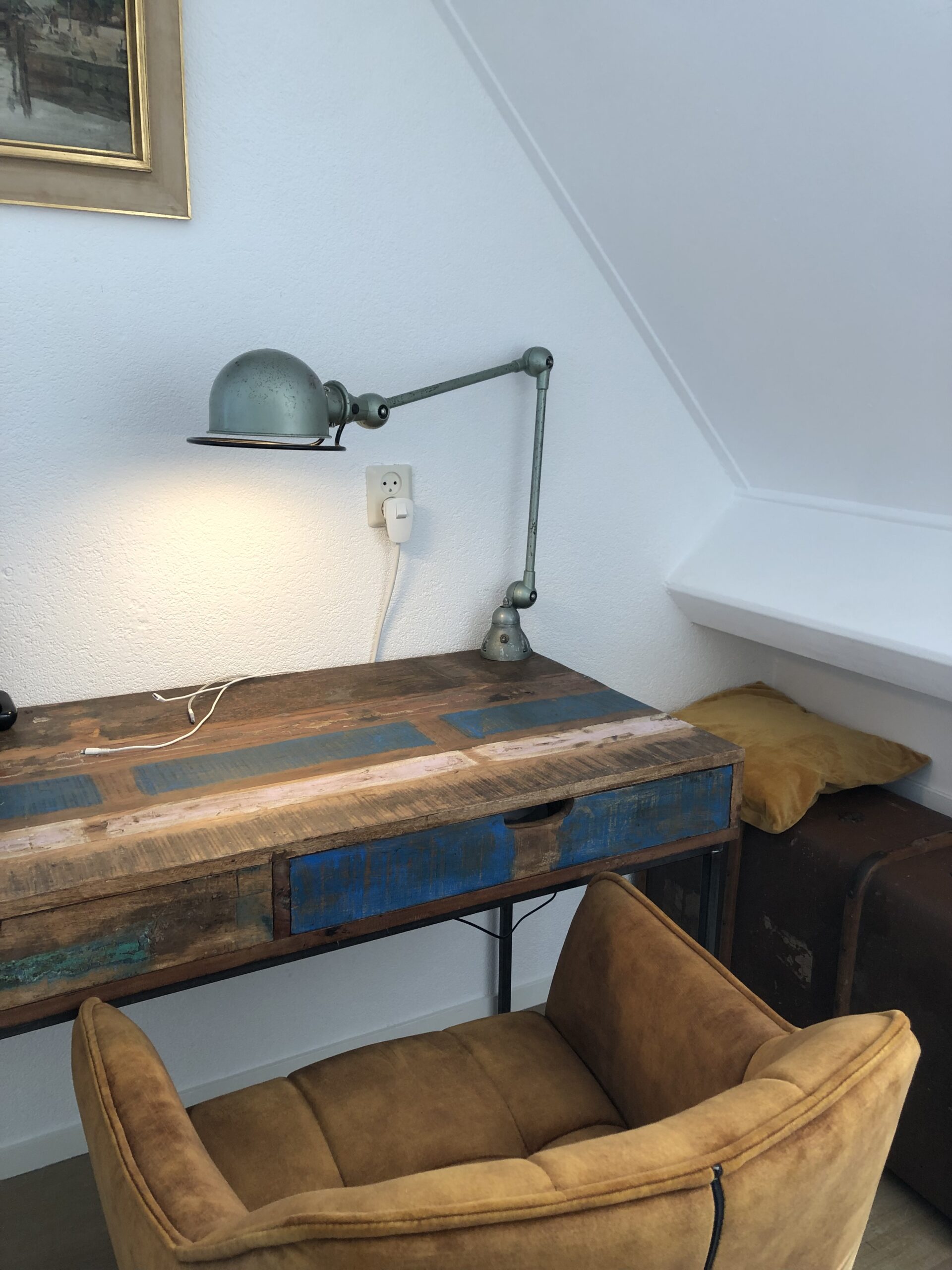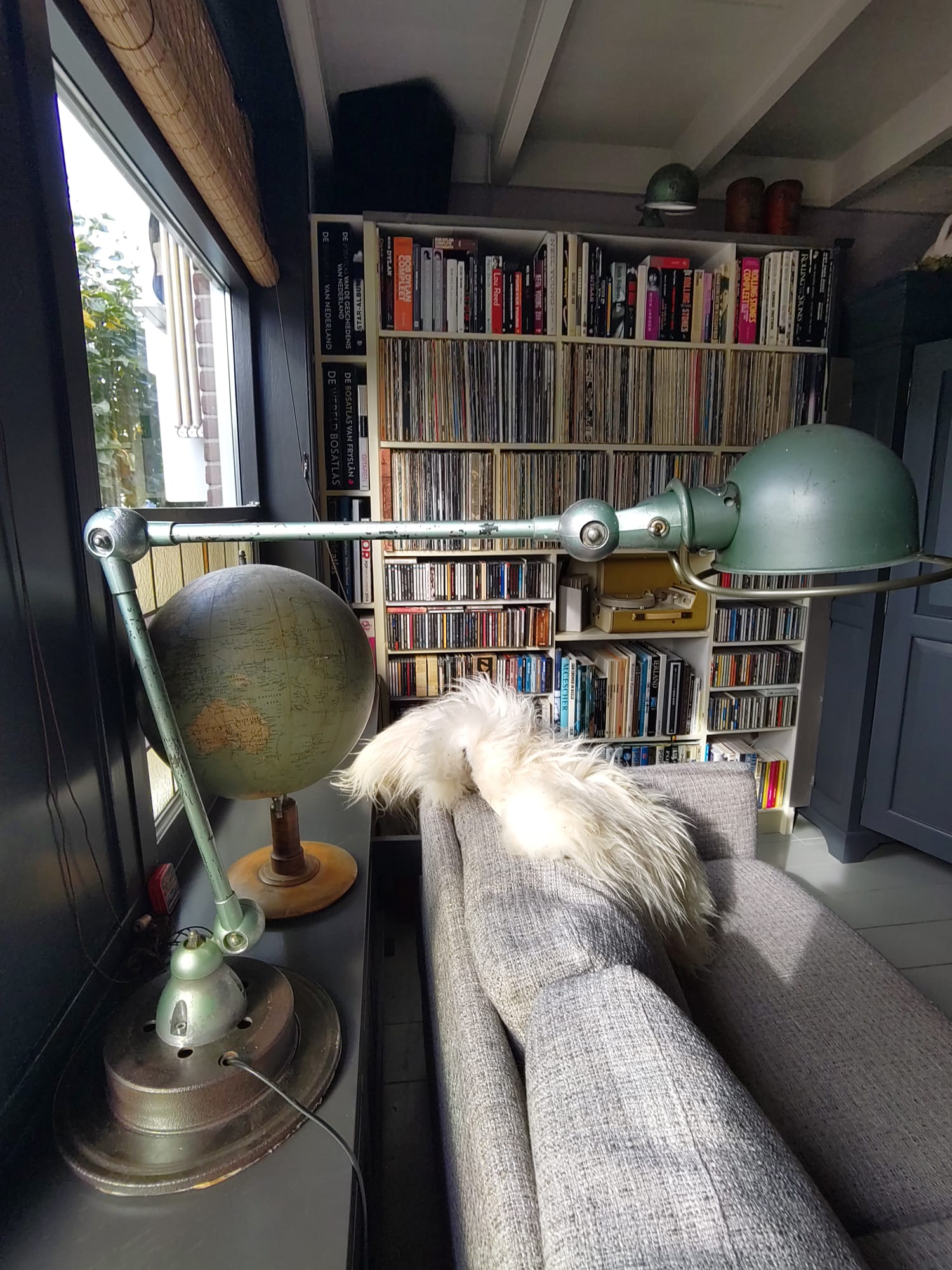 Myriam uit Groningen is helemaal verslingerd aan de Jieldé lampen. Het begon met één en inmiddels zijn het er al drie. Deze olijfgroene lamp heeft 4 armen en is geplaatst op een industriële remschijf als voet. Alle drie hebben ze een mooie plek gevonden. Wellicht komt lamp 4 er ook nog wel……..