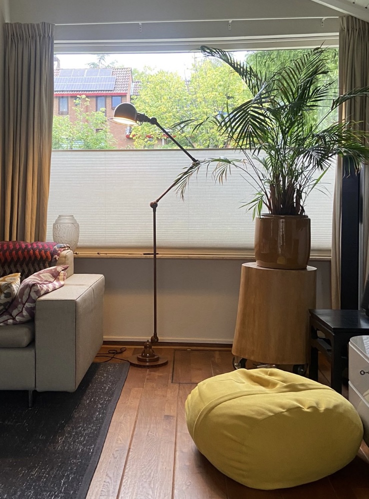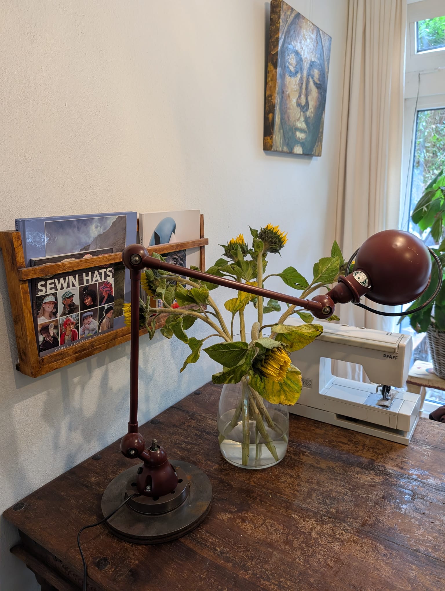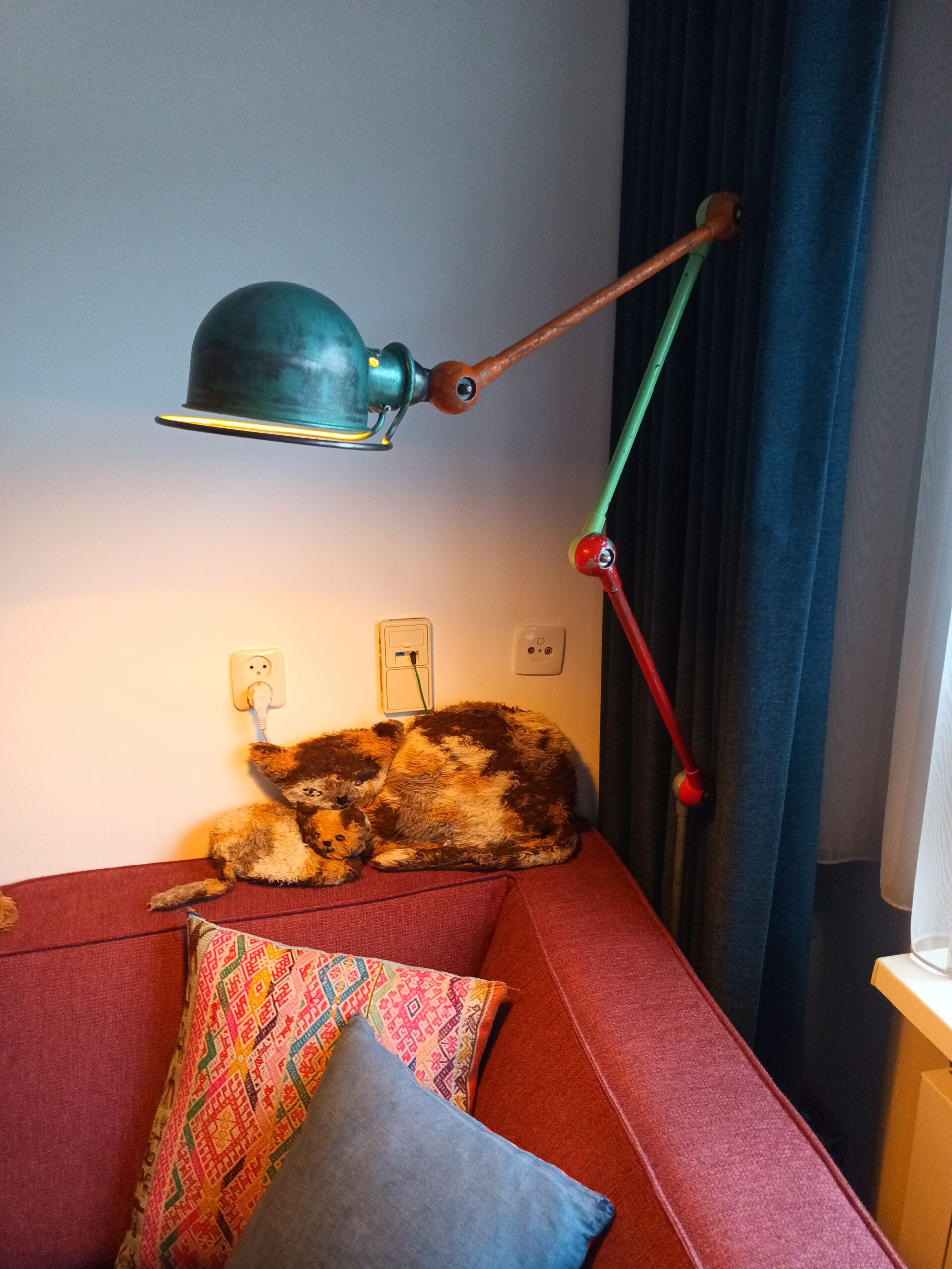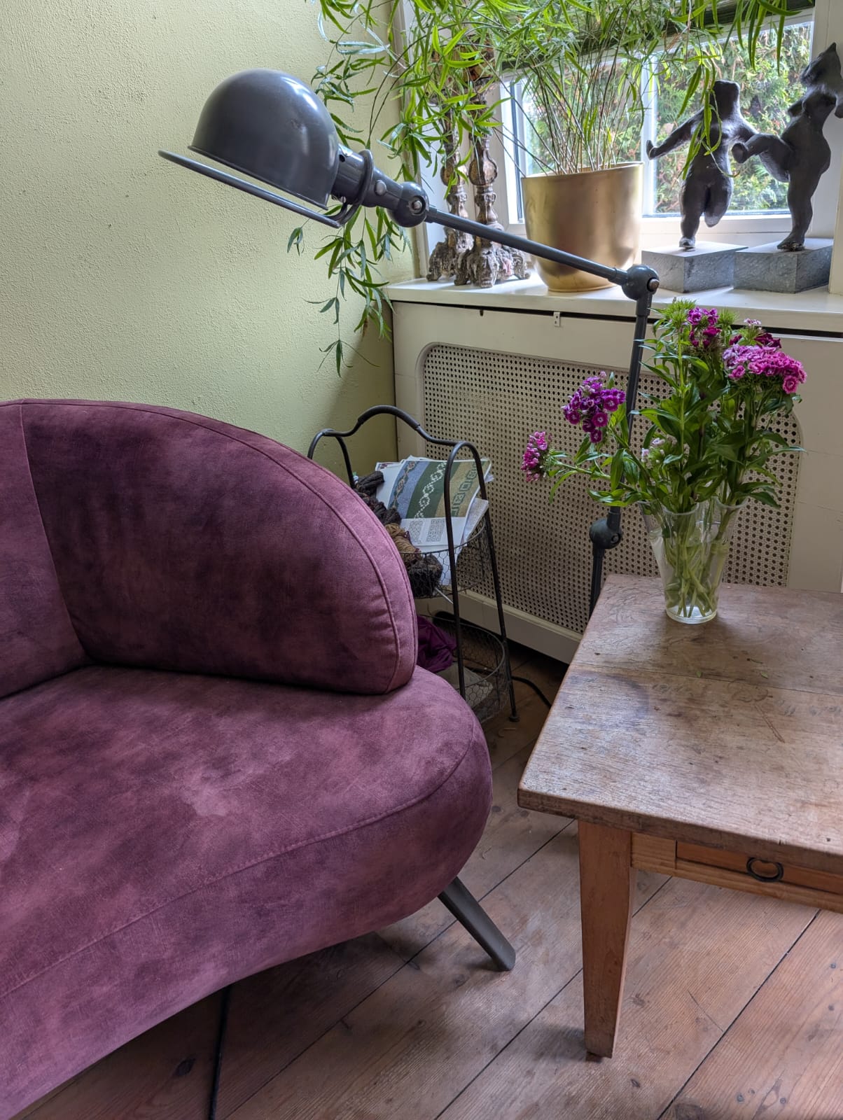 Myriam uit Groningen is helemaal verslingerd aan de Jieldé lampen. Het begon met één en inmiddels zijn het er al drie. Deze olijfgroene lamp heeft 4 armen en is geplaatst op een industriële remschijf als voet. Alle drie hebben ze een mooie plek gevonden. Wellicht komt lamp 4 er ook nog wel……..