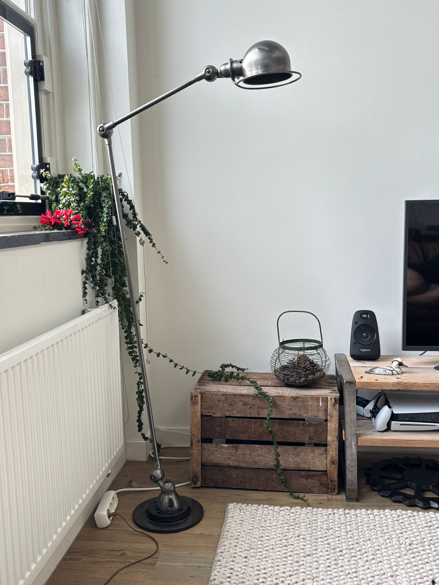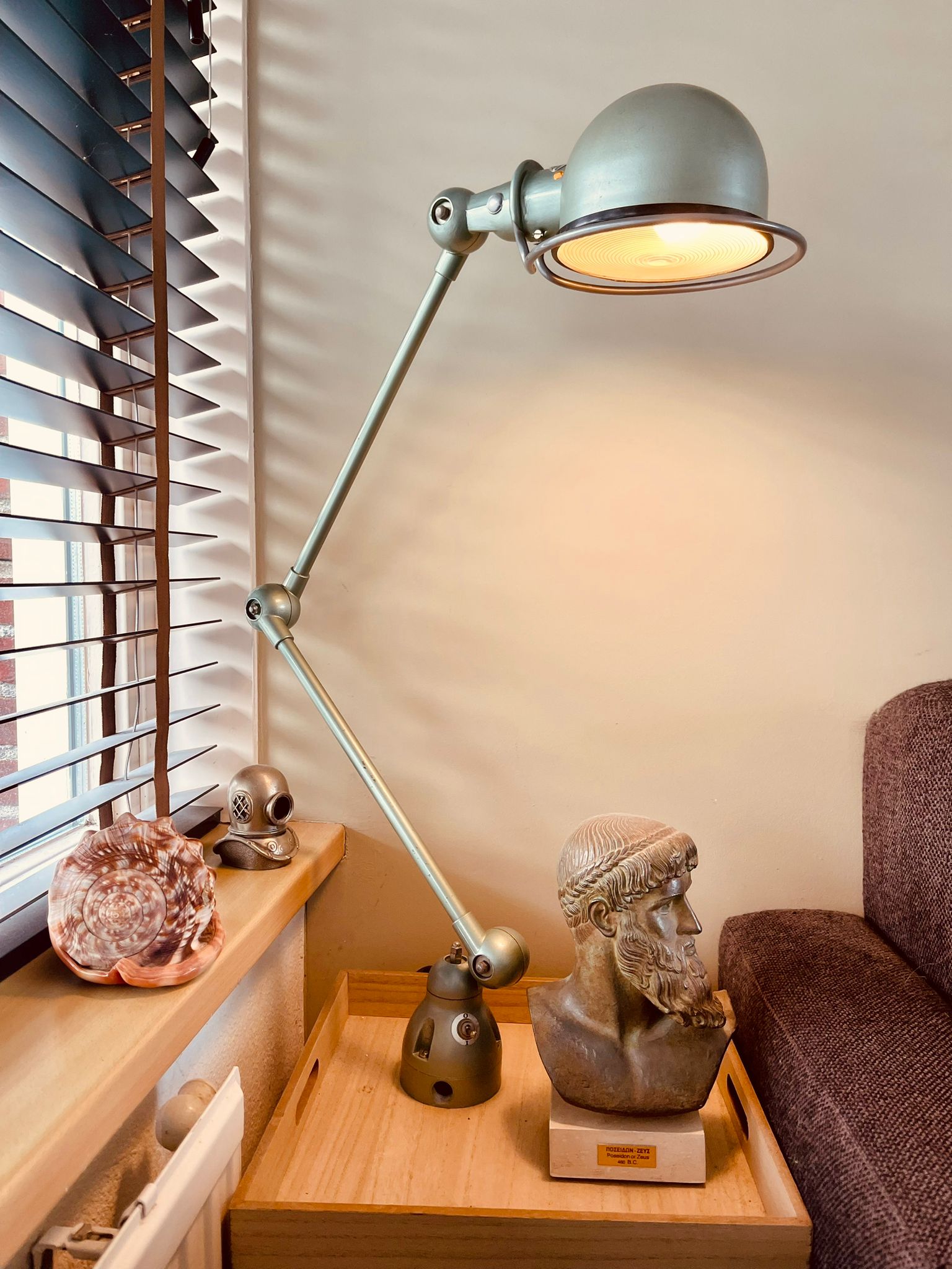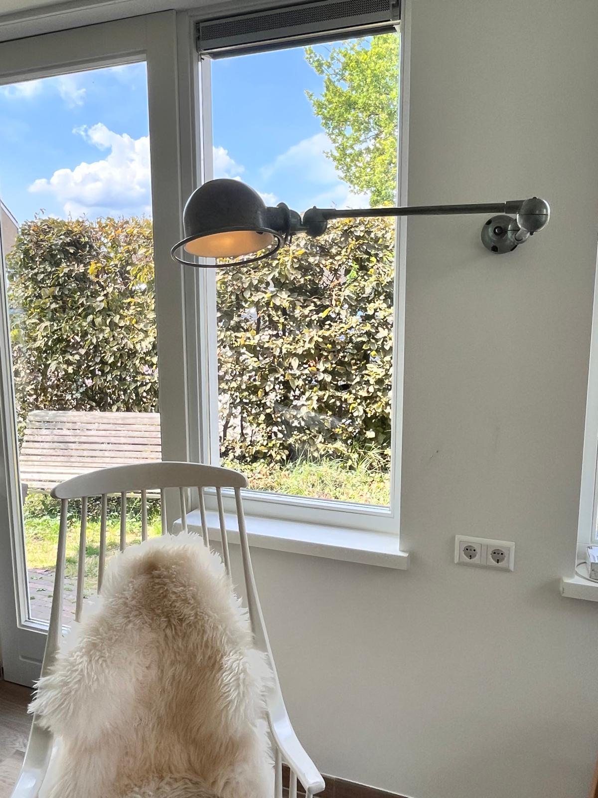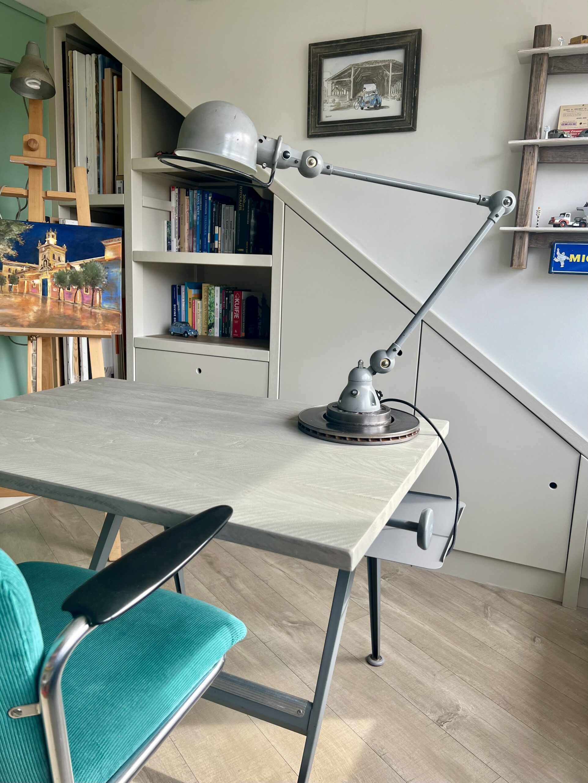 Je ziet jezelf hier al zitten lezen met deze machine grijze Jieldé als lees lamp.