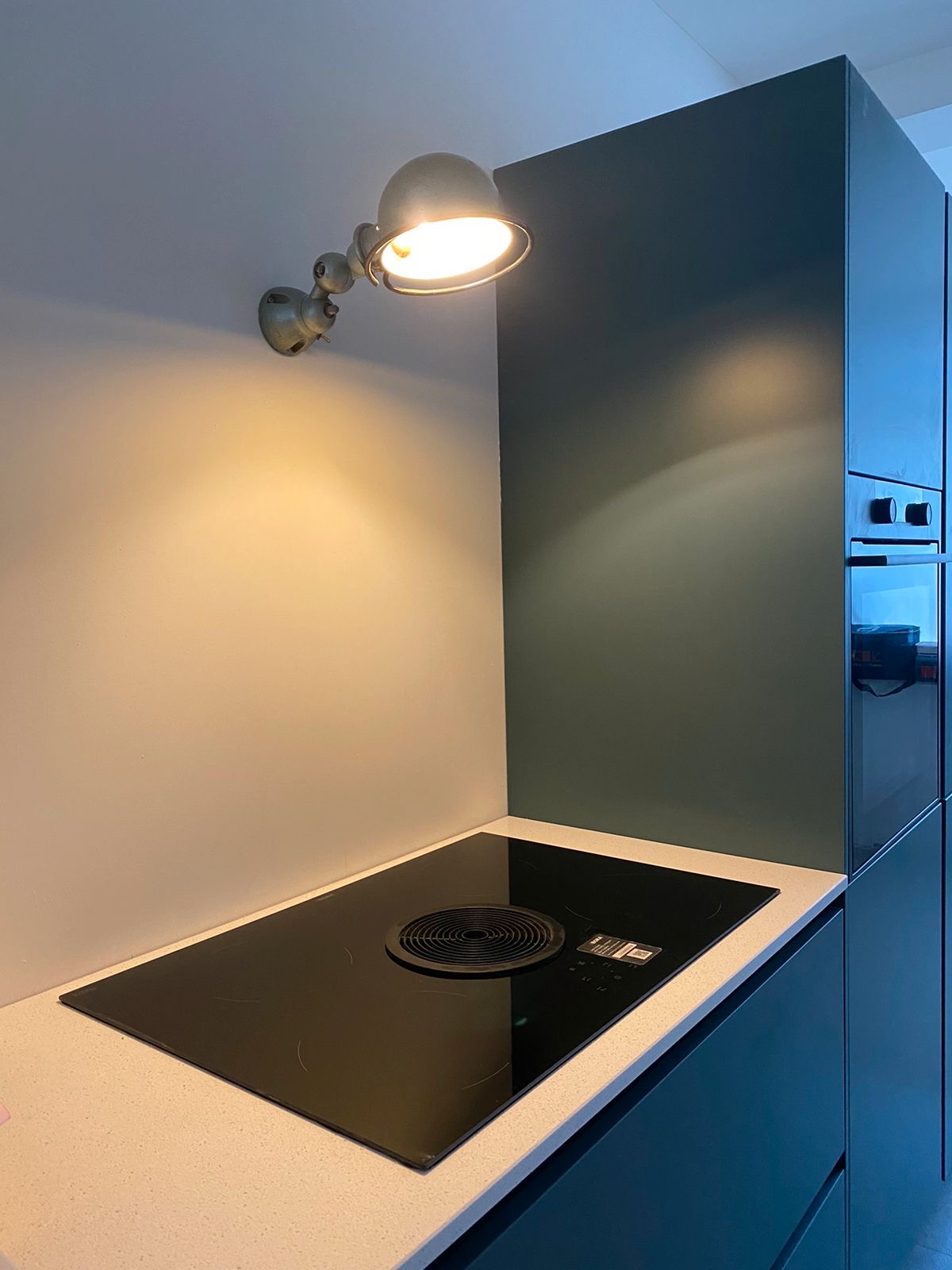 Een Jieldé als verlichting boven een kookplaat. Een beschermlens is dan aan te raden ivm stoom en condens.