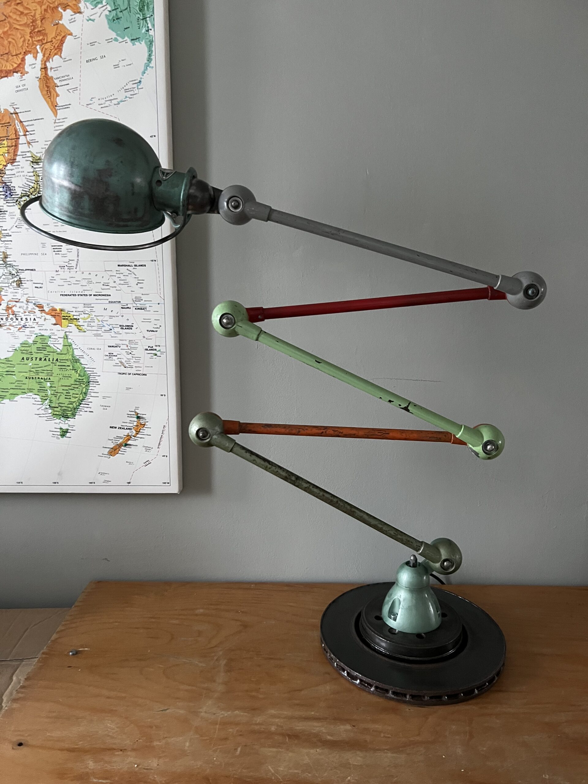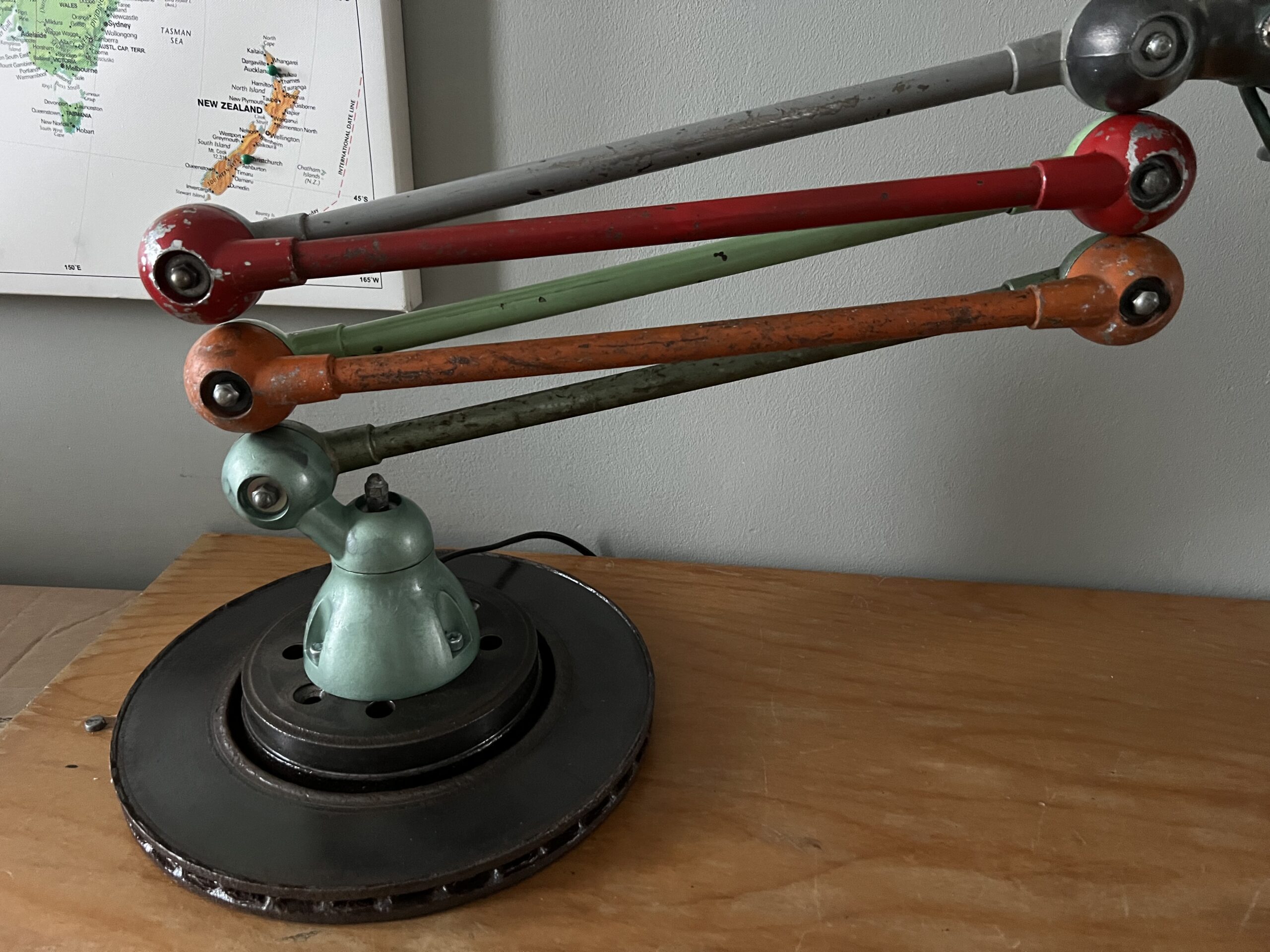 De Jieldé zoals waar hij voor bedoelt is. Als werkplek lamp. Een lamp met 2 armen in een wijnrode kleur. Ook deze lamp is geplaatst op een remschijf als voet. Een heel mooi plaatje.