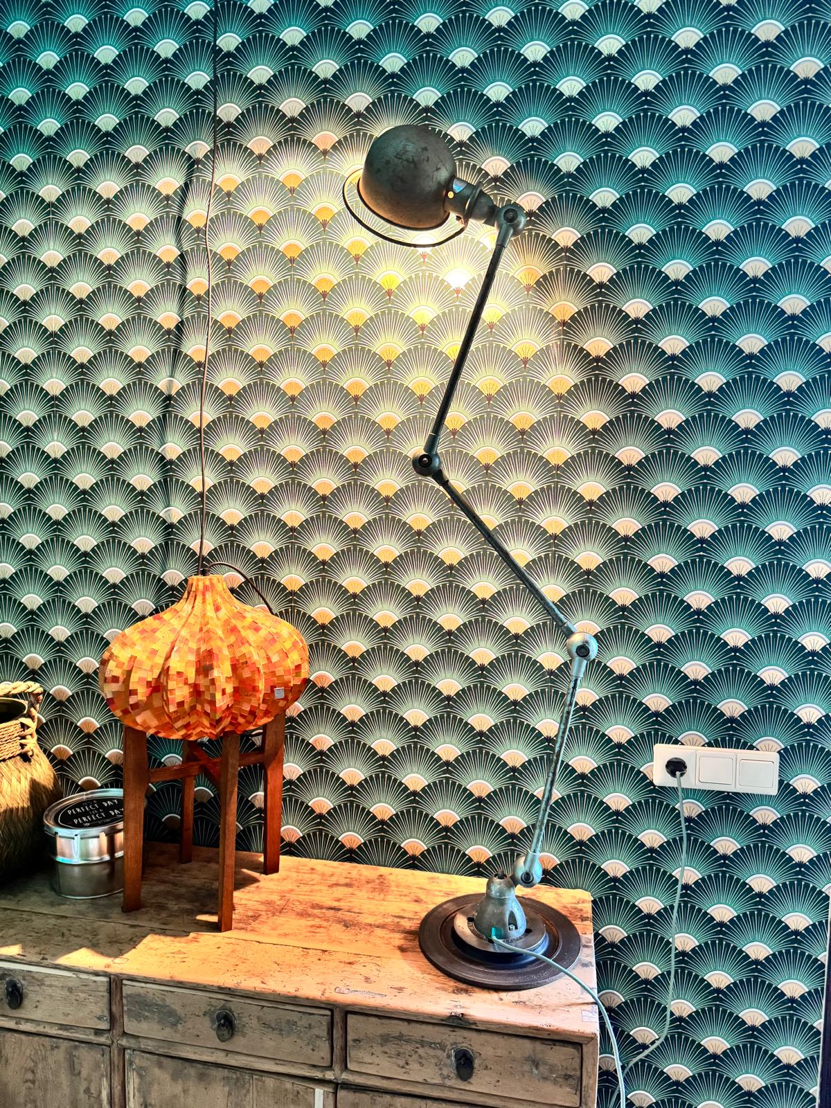 Een mooie groene sleetse lamp met drie armen in een mooi vintage interieur.