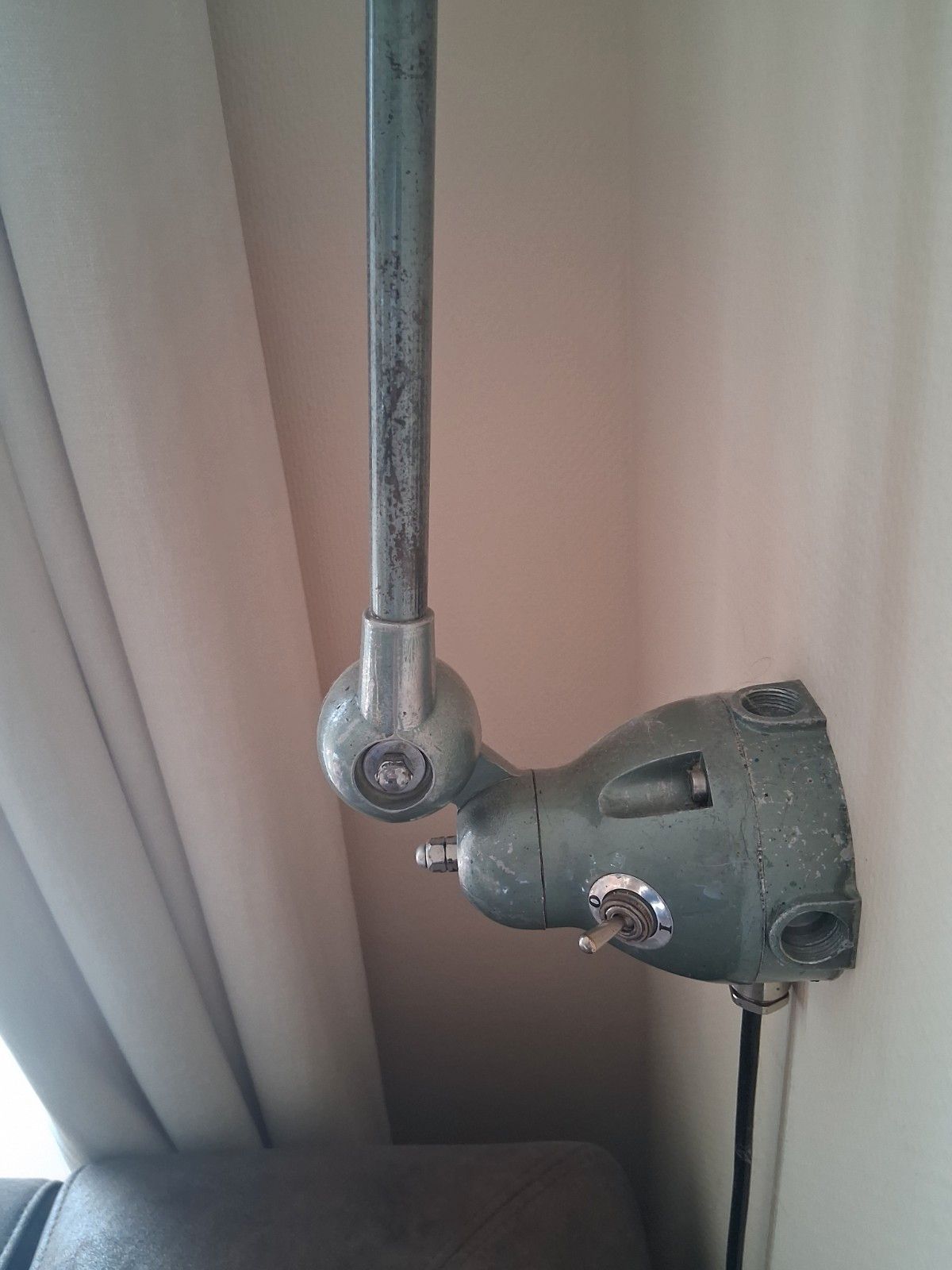 Als leeslamp bij de bank, een mooie machine grijze lamp met 3 armen geplaatst op een remschijf als voet.
