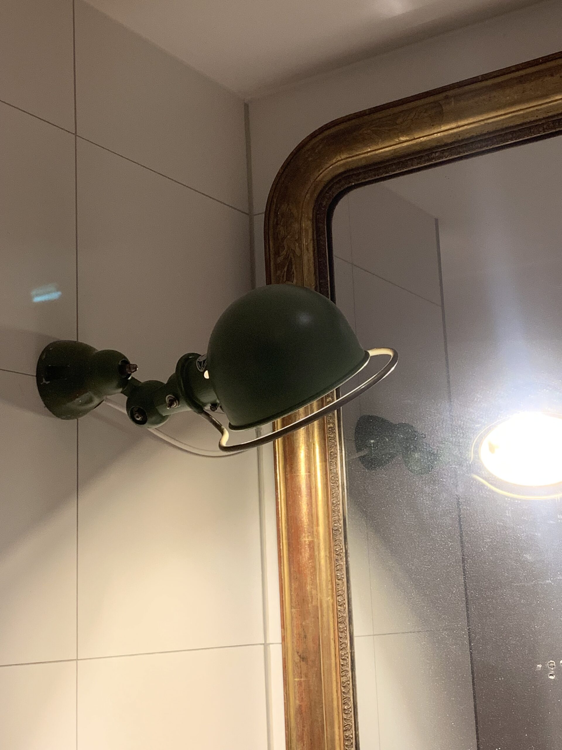 Kees uit Rotterdam heeft een gerestaureerde wandlamp in de Olijfgroene kleur bij zijn spiegel geplaatst. Een mooie combinatie van licht en reflectie.