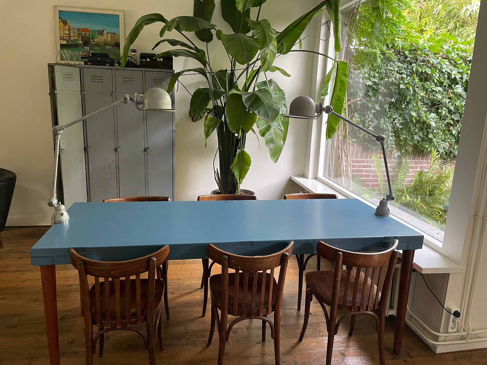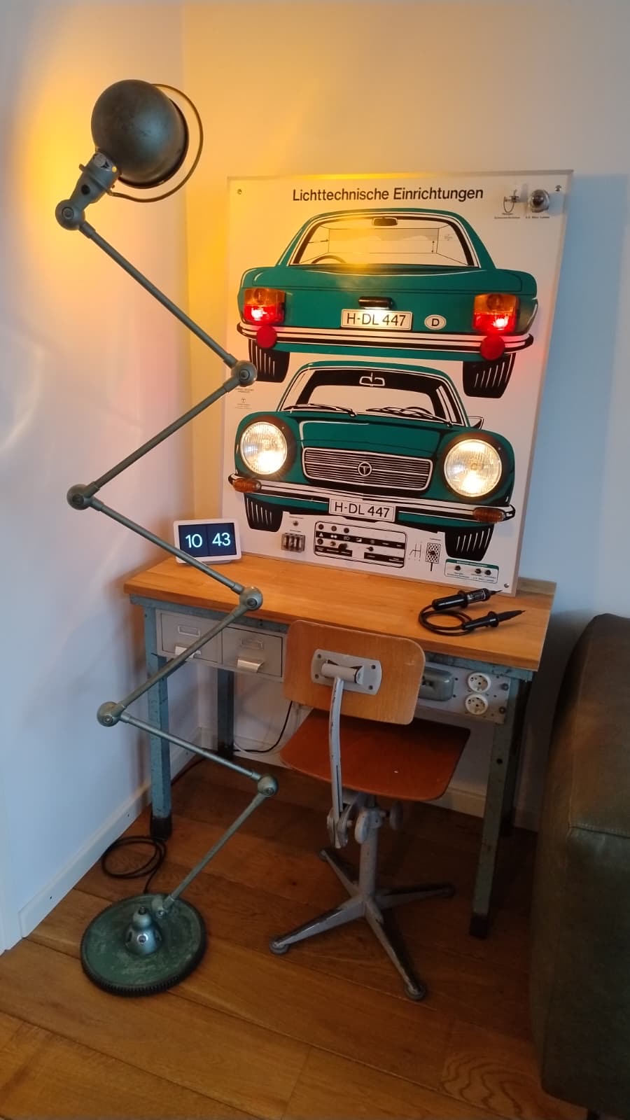 Een Jieldé als tekentafel lamp. De tekentafel is ontworpen door de Nederlandse ontwerpers Friso Kramer en Wim Rietveld. Zowel de lamp als de tekentafel zijn ontwerpen uit de jaren ’50.