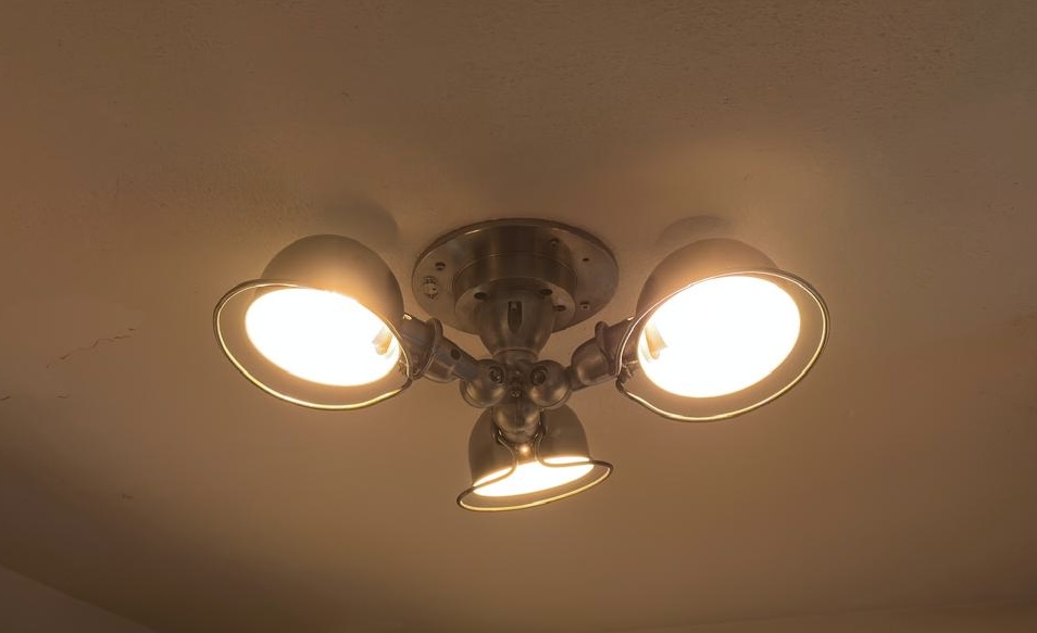 De drie lampen zijn gemonteerd op een drie delig hoekstuk en een lichtgewicht remschijf is als plafondplaat gebruikt. Erg mooi en uniek.